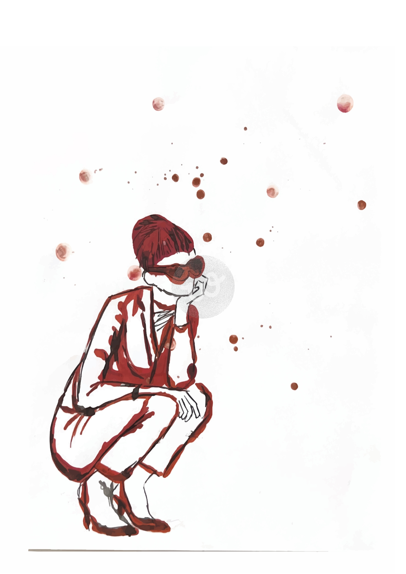 دعوة للتوقف واستكشاف الذات. امرأة جاثمة، مرسومة بخطوط حمراء قوية، تتأمل في عالمها الداخلي. نظاراتها الشمسية تخفي نظرتها، تاركة للمشاهد فرصة للتأمل في أفكارها ومشاعرها. بقع حمراء متناثرة تضفي حيوية على الخلفية البيضاء النقية، ترمز إلى الأفكار المتوهجة واللحظات العاطفية. الألوان والخطوط تخلق جواً من الهدوء والتأمل، بينما تثير البقع الحمراء لمسة من الشغف والغموض. هذه اللوحة هي إضافة مثالية لأي مساحة تبحث عن الإلهام والتأمل، ودعوة لتقدير لحظات الهدوء في عالمنا الصاخب.