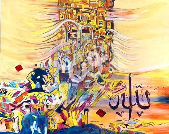 يظهر العمل تكوينًا بصريًا يعتمد على أشكال متداخلة وألوان دافئة، تتوزع بين الأصفر والبرتقالي مع لمسات لونية متباينة. تتكرر الخطوط المنحنية والعناصر المعمارية في منتصف اللوحة، مع وجود كتابات وعناصر خطية في الجهة اليمنى. الأسلوب تجريدي، ويعتمد على تراكب الطبقات وتداخل الأشكال، مع خلفية بسيطة تبرز تفاصيل التكوين الرئيسي.