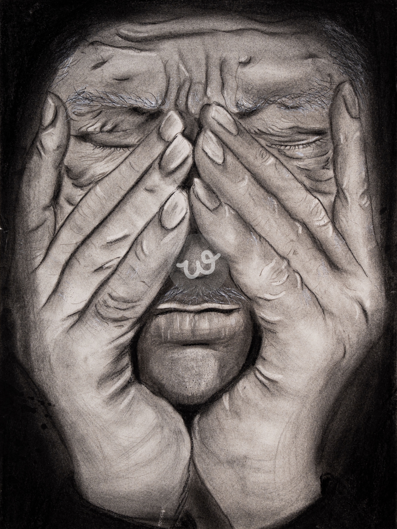 تصور هذه اللوحة المرسومة بأقلام الرصاص والفحم ملامح رجل منهك، يخفي عينيه بين يديه، وكأن ثقل الحياة قد ألقى كله عليه. تفاصيل التجاعيد العميقة في وجهه وانحناءة يديه تعكس سنواتٍ من الجهد والتعب الذي يبذله الآباء في سبيل عائلاتهم. الظلال القوية والتباين الحاد بين الضوء والظلام يبرزان الإرهاق المتراكم، وكأن اليدين لا تحجبان العينين فقط، بل تحاولان احتواء الألم والتضحيات التي لا تُرى.