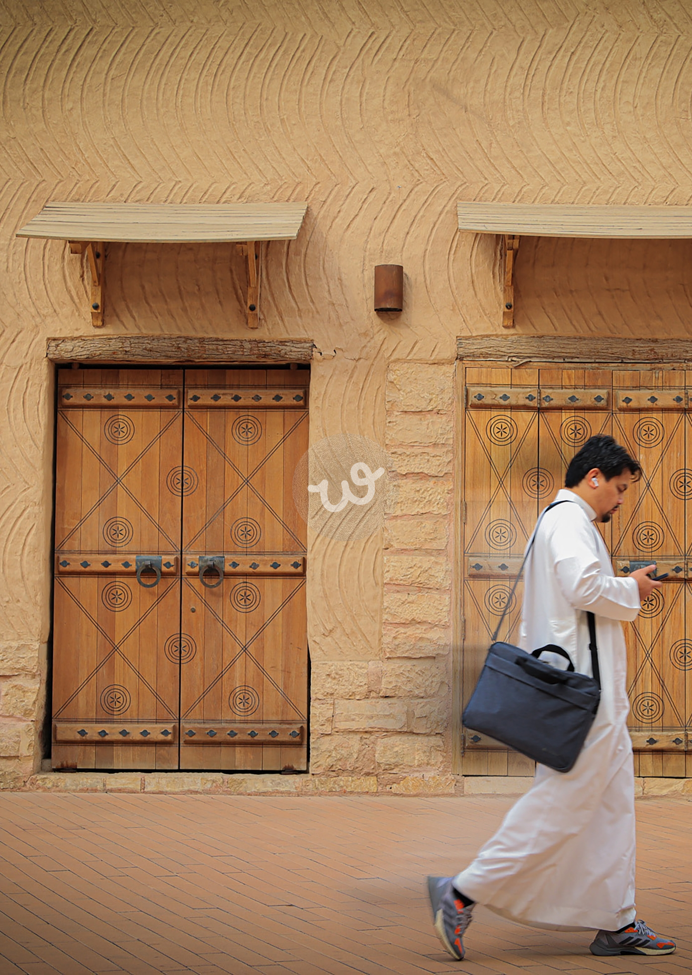 رجل يرتدي الزي السعودي التقليدي يسير بجانب مبنى تراثي يحمل طابعاً تاريخياً