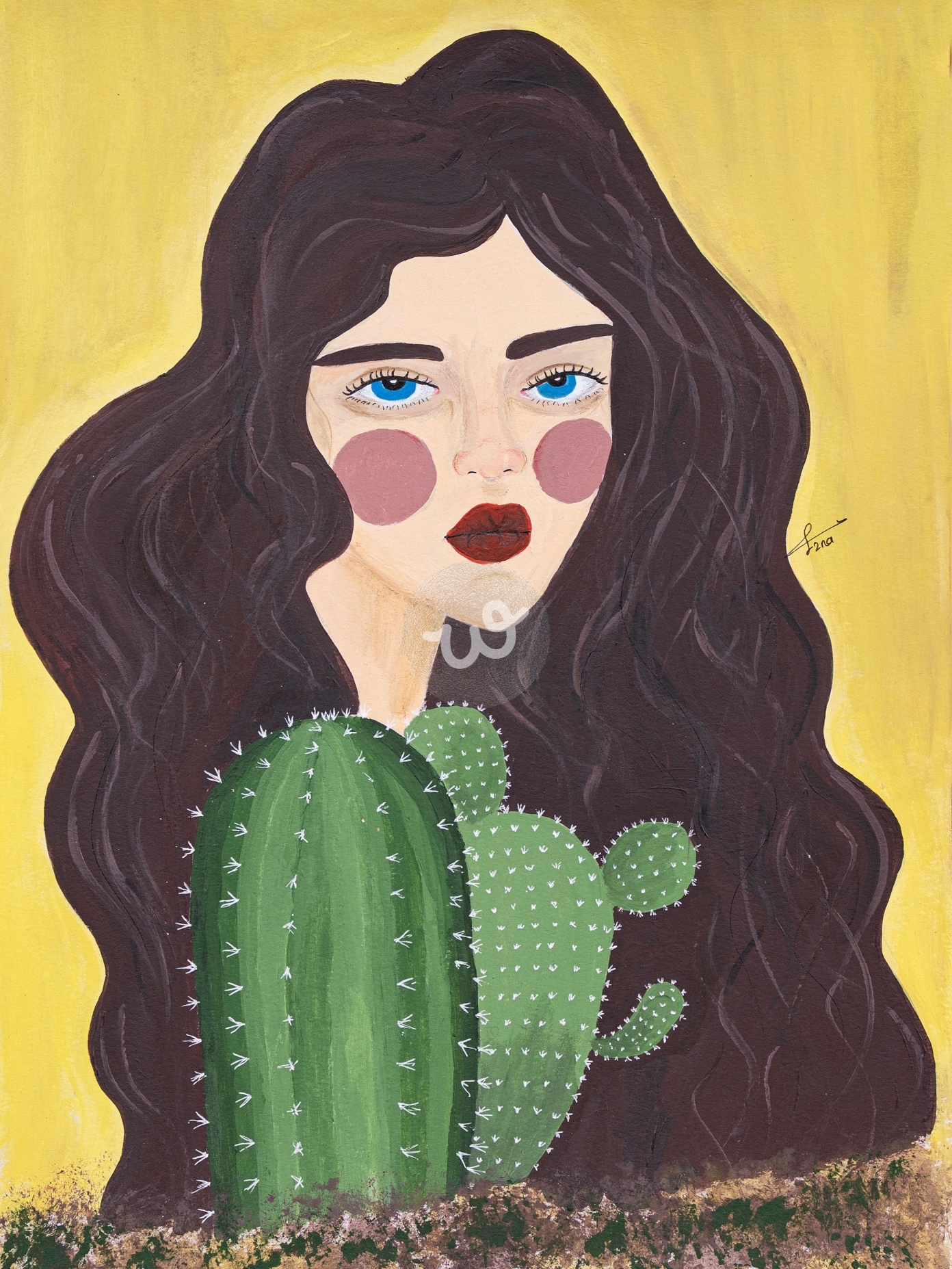 توضح هذه اللوحة المرسومة اندماج الجمال البشري وقدرة الانثى الناعمة بذاتها على التحمل. تتباين عيون المرأة الزرقاء الثاقبة وشفتيها الحمراء العميقة وخديها المتدفقتين مع شعرها الداكن المتدفق، والذي يمتزج بسلاسة مع الألوان الترابية. على عكس وجهها الجميل يظهر جسدها بشكل صبار - أشواكه الحادة ترمز إلى القوة والحماية والبقاء على قيد الحياة رغم الشدائد. يجسد التناقض بين ملامحها الناعمة والملمس الوعر للصبار تعايش الضعف والمرونة. اشواك ناعمة هو تمثيل قوي لكيفية ازدهار الجمال والقوة معًا،
