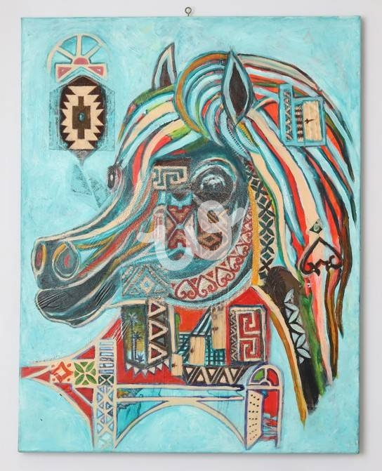 ألوان أكريلك وقصاصات قماشية ومعجون على لوحة قماش كانفوس ورسم بورتريه حصان باسلوب تجريدي
