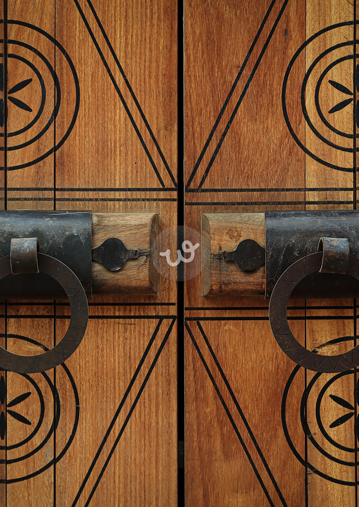 باب خشبي تقليدي بتصميم هندسي متناظر، مزخرف بنقوش دائرية ونجمية دقيقة، مع مقابض معدنية دائرية تضيف لمسة تراثية أنيقة