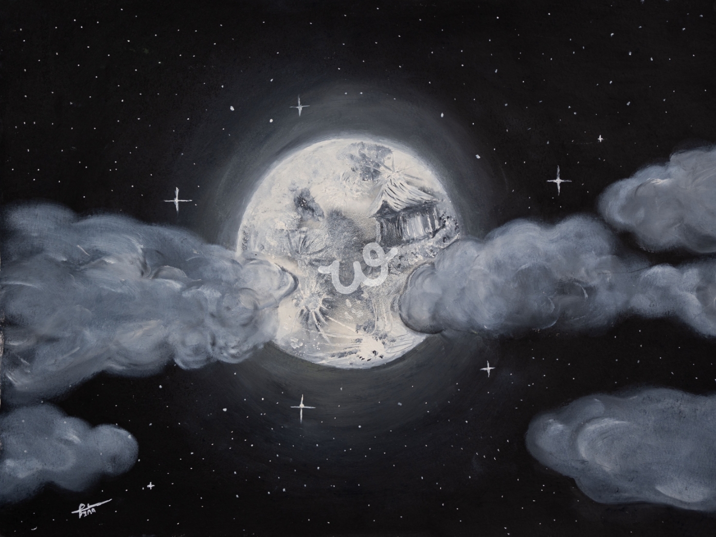 تصور هذه اللوحة رؤية غامضة للقمر، محجوب جزئيًا بالغيوم العابرة. على عكس جرم سماوي قاحل، يحمل هذا القمر سرًا خفيًا — منزلًا صغيرًا ومنفردًا متواريًا داخل سطحه المليء بالفوهات. يبدو البناء وكأنه خالد، كما لو كان ينتمي إلى حلم منسي أو مسافر بعيد يبحث عن ملاذ في الفضاء الكوني. تضيف الغيوم الناعمة والدوامية جوًا سرياليًا يشبه الحلم، وتندمج في السماء الليلية الشاسعة المرصعة بالنجوم المتلألئة. تعزز الألوان الأحادية الإحساس بالغموض، مما يدعو المشاهد إلى تخيل القصص التي يحملها هذا الملاذ القمري.