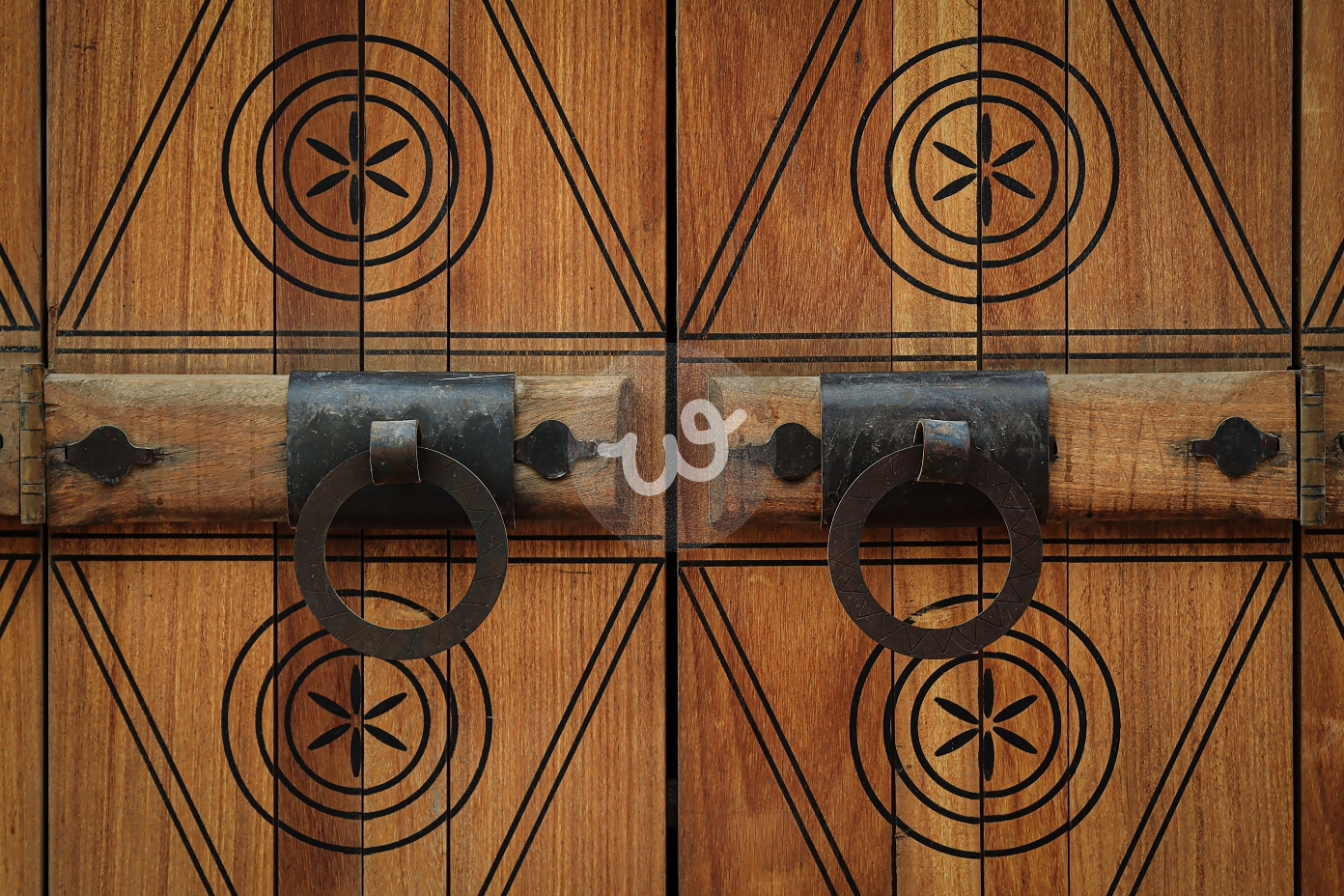 باب خشبي تقليدي بتصميم هندسي متناظر، مزخرف بنقوش دائرية ونجمية دقيقة، مع مقابض معدنية دائرية تضيف لمسة تراثية أنيقة