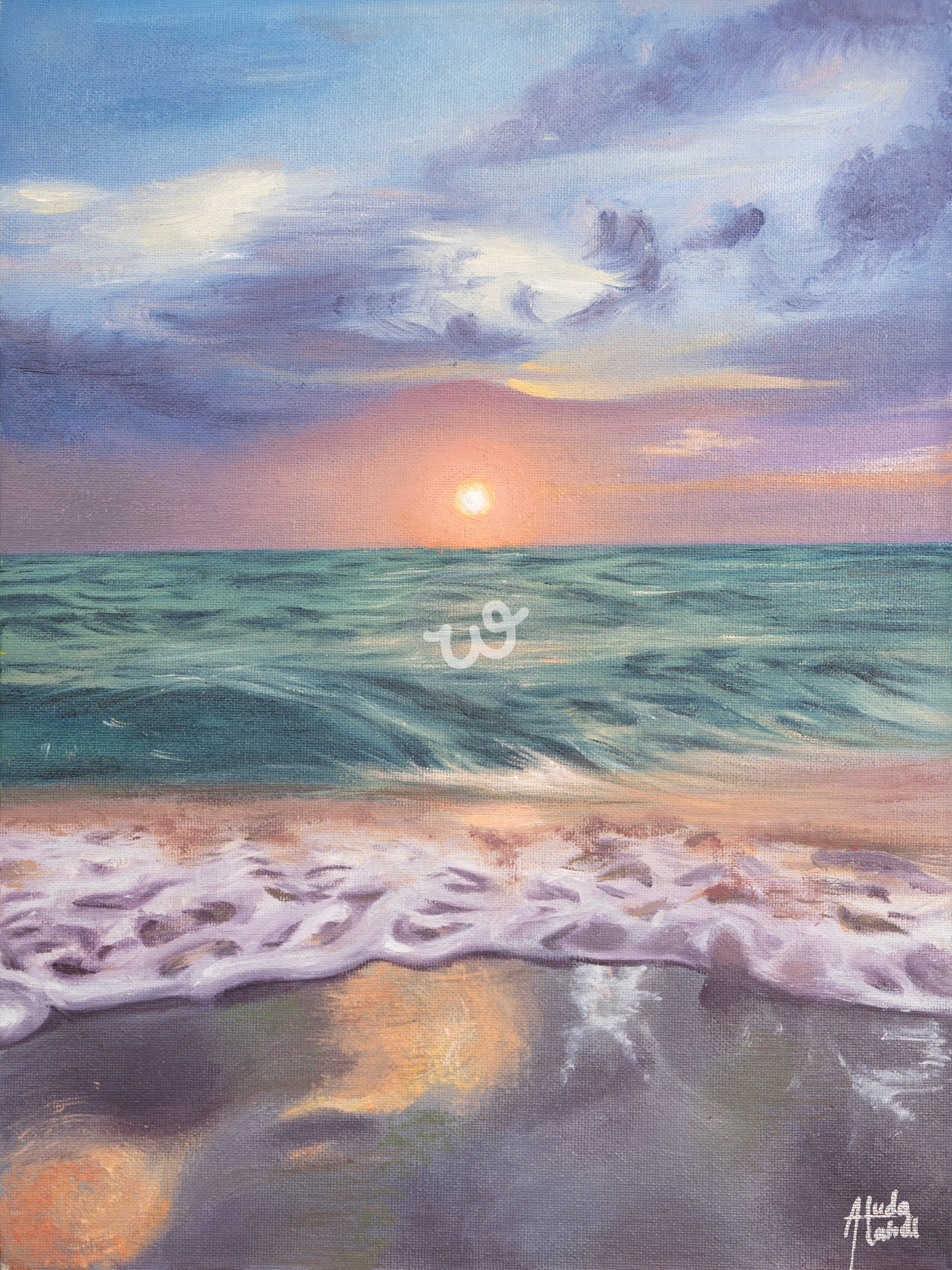 تظهر اللوحة مشهدًا لغروب الشمس على الشاطئ حيث تتمازج ألوان السماء الرائعة بين البرتقالي، الأرجواني، والأزرق في تدرجات ساحرة. تتلاطم الأمواج بهدوء على الشاطئ، مما يضيف روحًا من الحركة الرقيقة. تعبر اللوحة عن لحظة من التأمل والسلام الداخلي، حيث يرمز الغروب إلى نهاية يوم مليء بالذكريات وبداية جديدة مليئة بالأمل والتجدد. إنها دعوة للتفكر في جمال الطبيعة ورحلتها الدائمة.