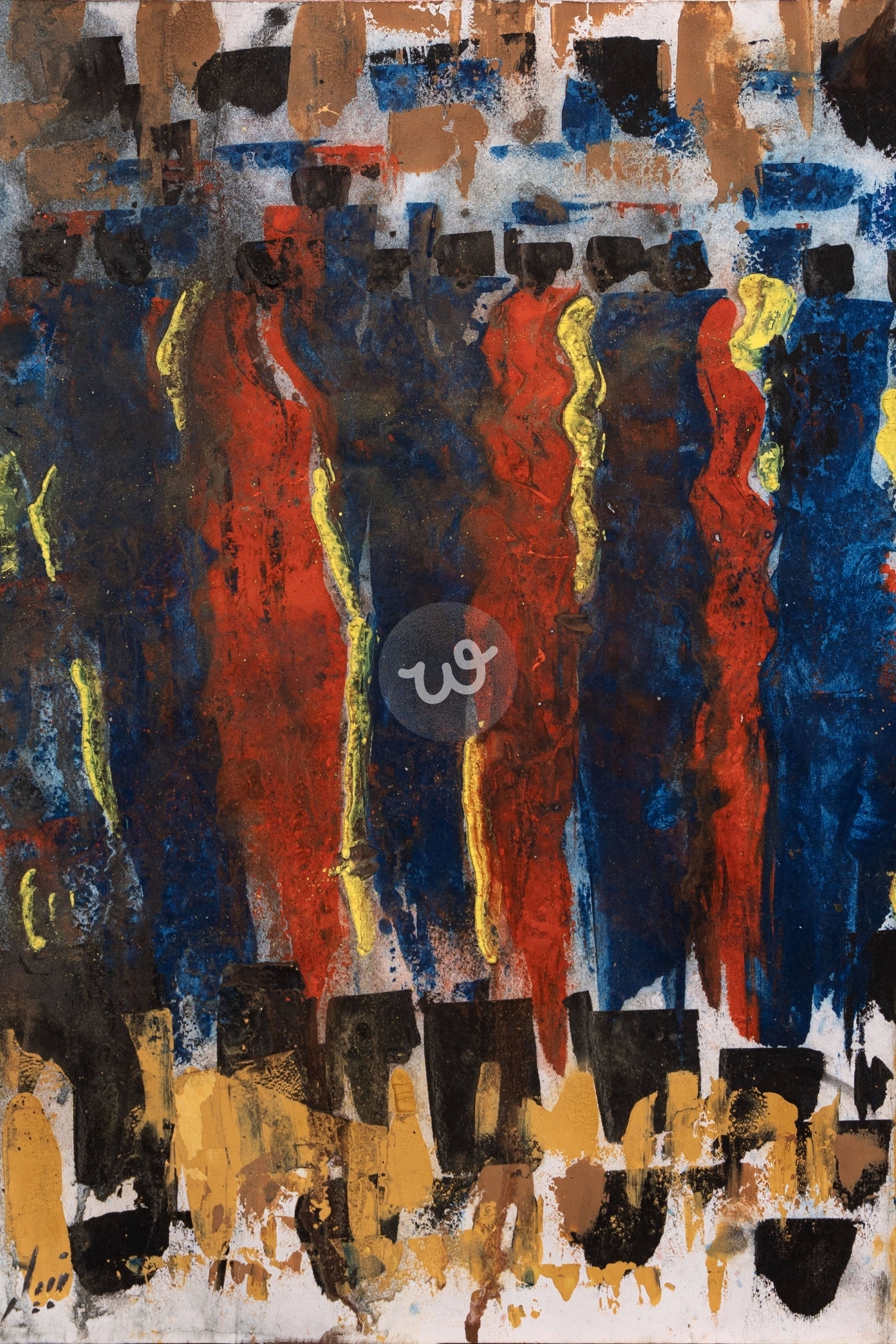 لوحة تجريدية تجمع بين الطاقة والحيوية من خلال خطوط وألوان متداخلة تعكس التناغم بين الحركة والتفاعل البصري.