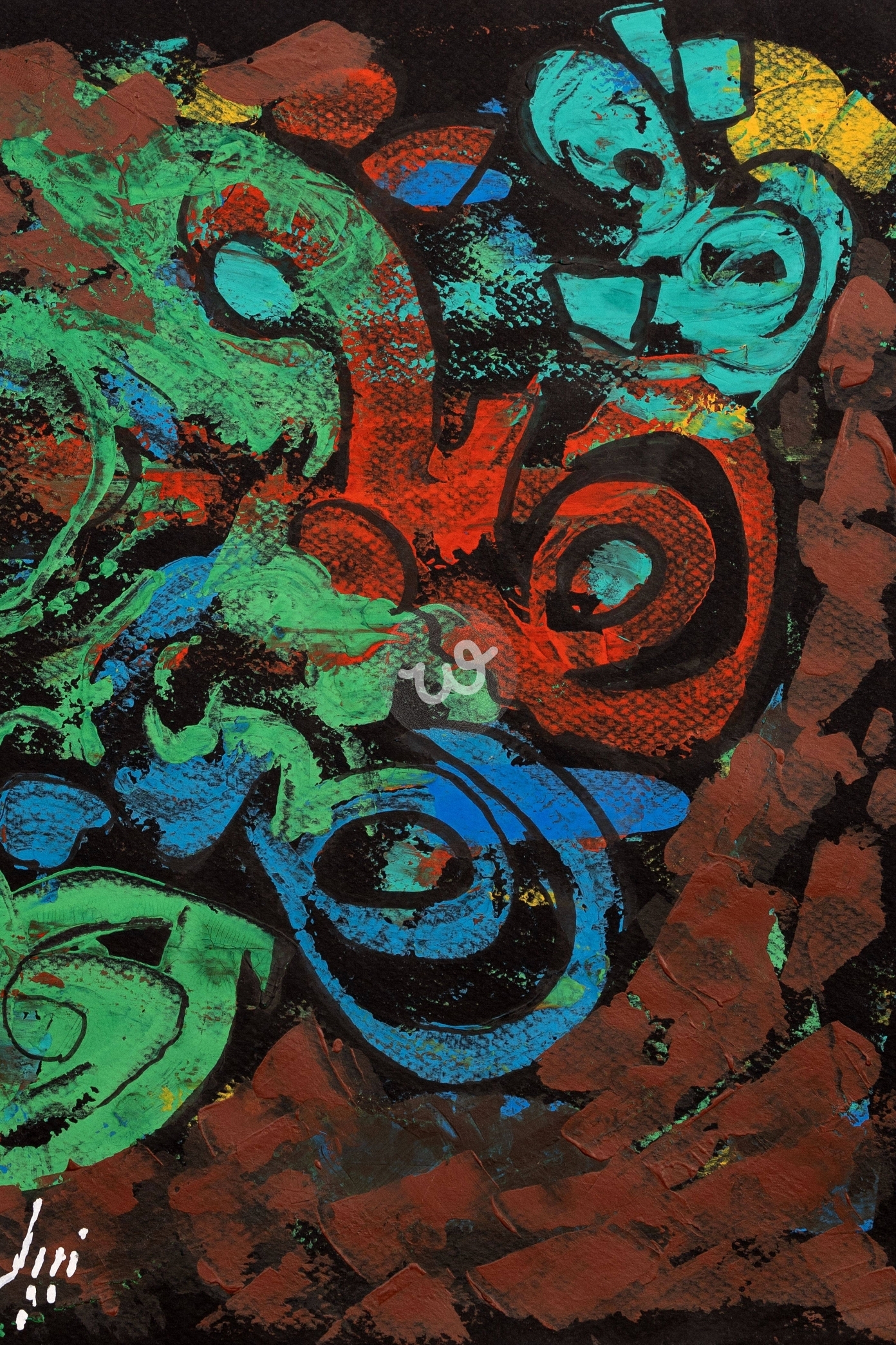 لوحة تجريدية نابضة بالحركة والطاقة، تجمع بين الألوان الجريئة والأشكال الديناميكية لتعبّر عن التناغم بين الفوضى والجمال في الحياة.