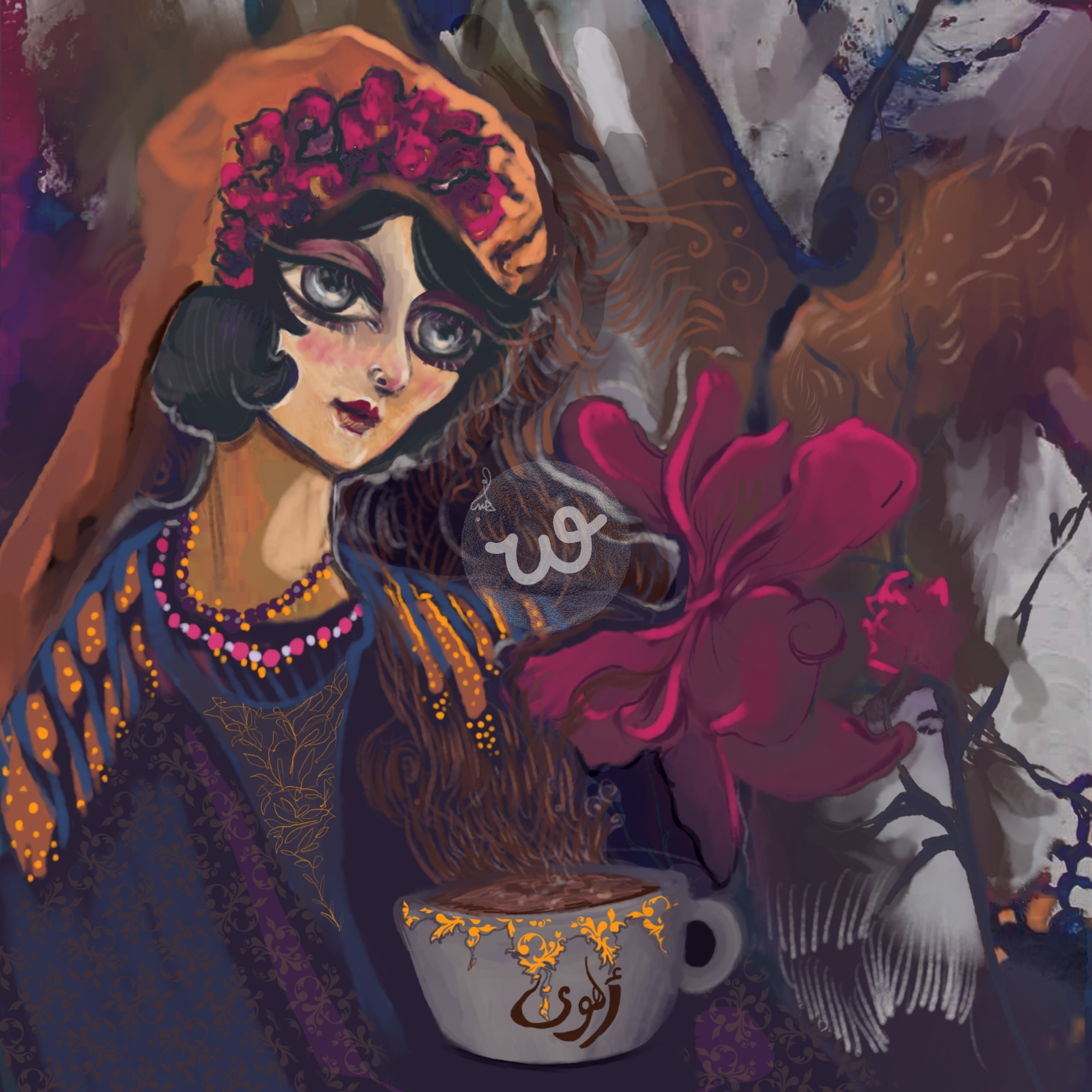 عمل فني مرسوم رقميا يعكس ويعبر عن أثر القهوة على روح فتاة