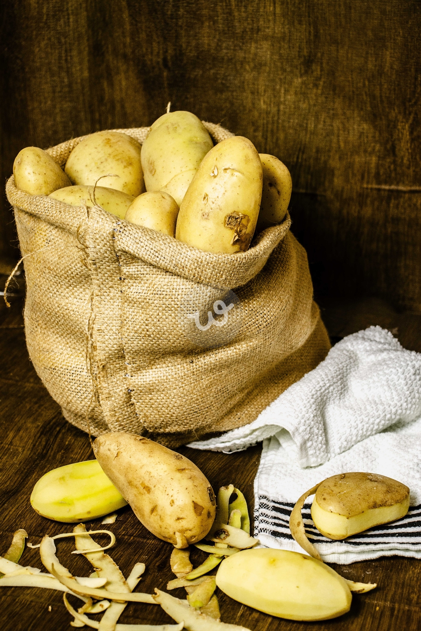 عمل تركيبي يجمع بين البطاطس كرمز للأرض والجذور، والخيش كخامة خام تعكس القسوة والبدائية. تتوزّع حبات البطاطس على سطح منسوج من الخيش، بعضها كامل محافظ على قشرته الترابية، وبعضها مقشَّر جزئيًا فيكشف لونها الفاتح تحت القشرة