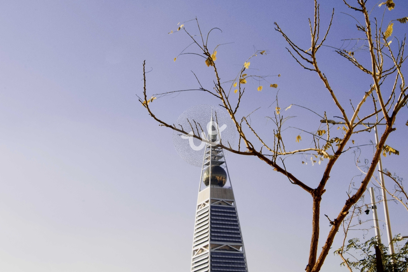 مشهد يلتقي فيه غصن شجرة حيّ مع خطوط برج الفيصلية اللامعة، في توازن بين حيوية الطبيعة وجرأة المعمار