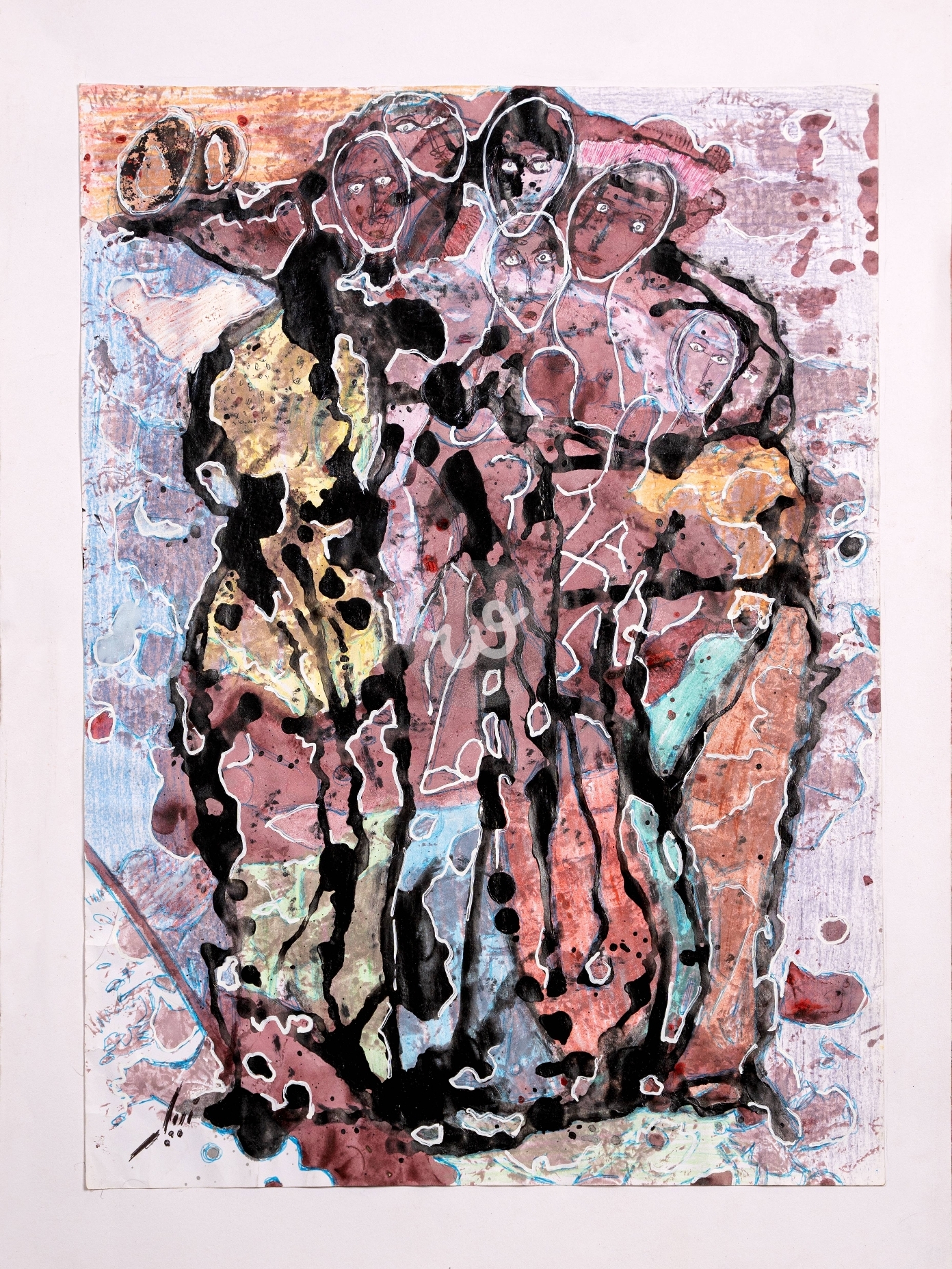 لوحة تجريدية تعبر عن التفاعل بين الشخصيات المختلفة باستخدام الألوان الجريئة والخلفية الديناميكية. تكشف عن رؤية فنية متميزة تسلط الضوء على الحركة والعلاقات المتداخلة بين العناصر.