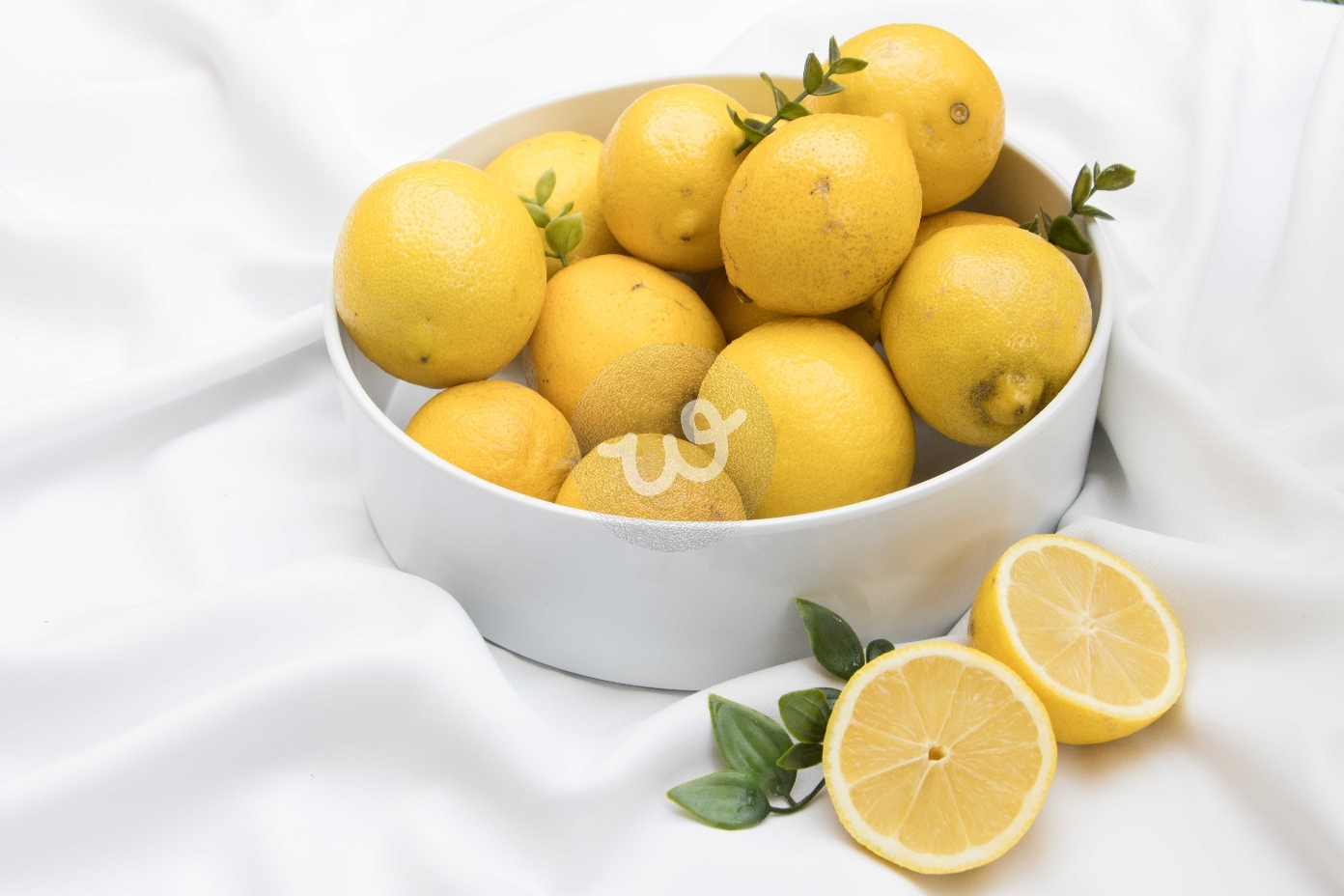 صحن أبيض ممتلئ بحبات ليمون زاهية تتناثر بينها أوراق نبات خضراء صغيرة، يحيط بها خلفية بيضاء ناصعة تُبرز إشراقة اللون الأصفر وحيويته