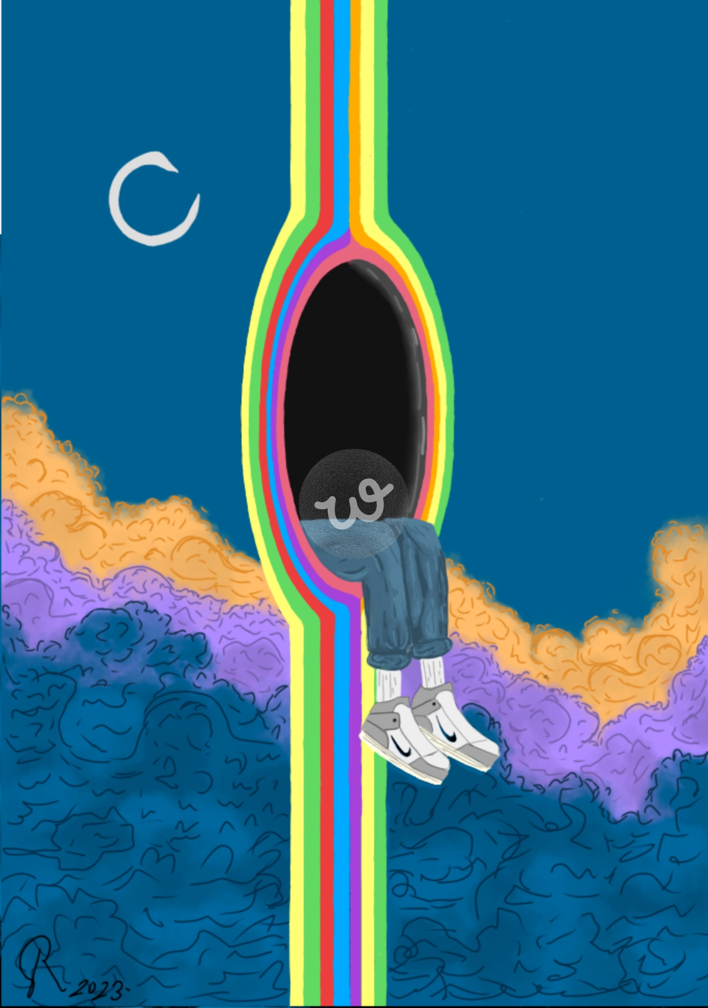 عمل يدمج الخيال والغرابة، يظهر فيه جزء من شخص يخرج من بوابة بيضاوية سوداء محاطة بخطوط قوس قزح، وسط ألوان تمثل الغيوم والتضاريس، ما يوحي بالانتقال بين العوالم أو الأبعاد