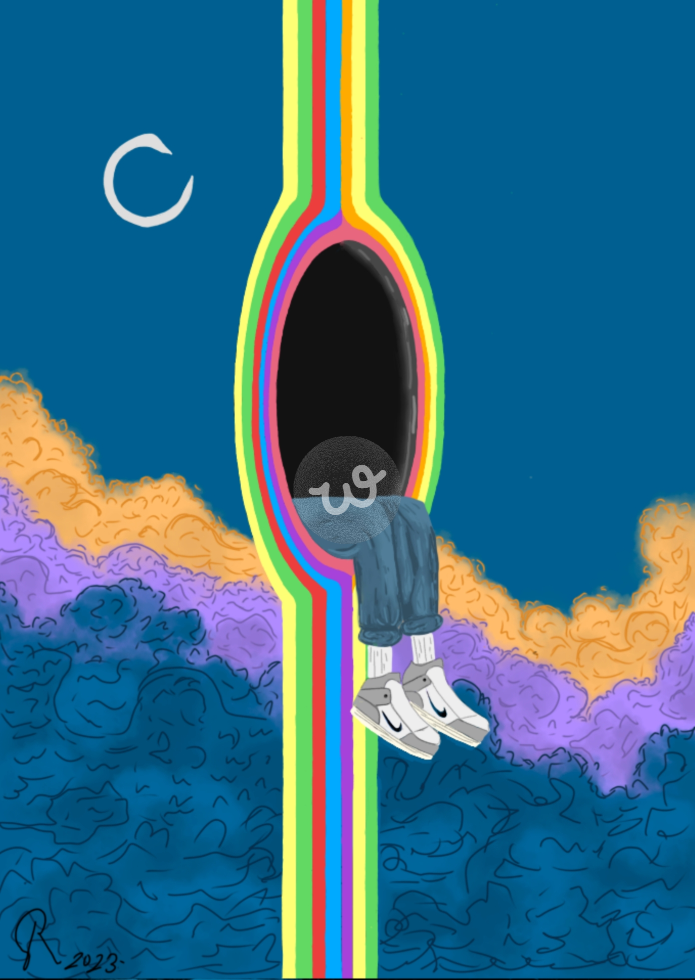 عمل يدمج الخيال والغرابة، يظهر فيه جزء من شخص يخرج من بوابة بيضاوية سوداء محاطة بخطوط قوس قزح، وسط ألوان تمثل الغيوم والتضاريس، ما يوحي بالانتقال بين العوالم أو الأبعاد