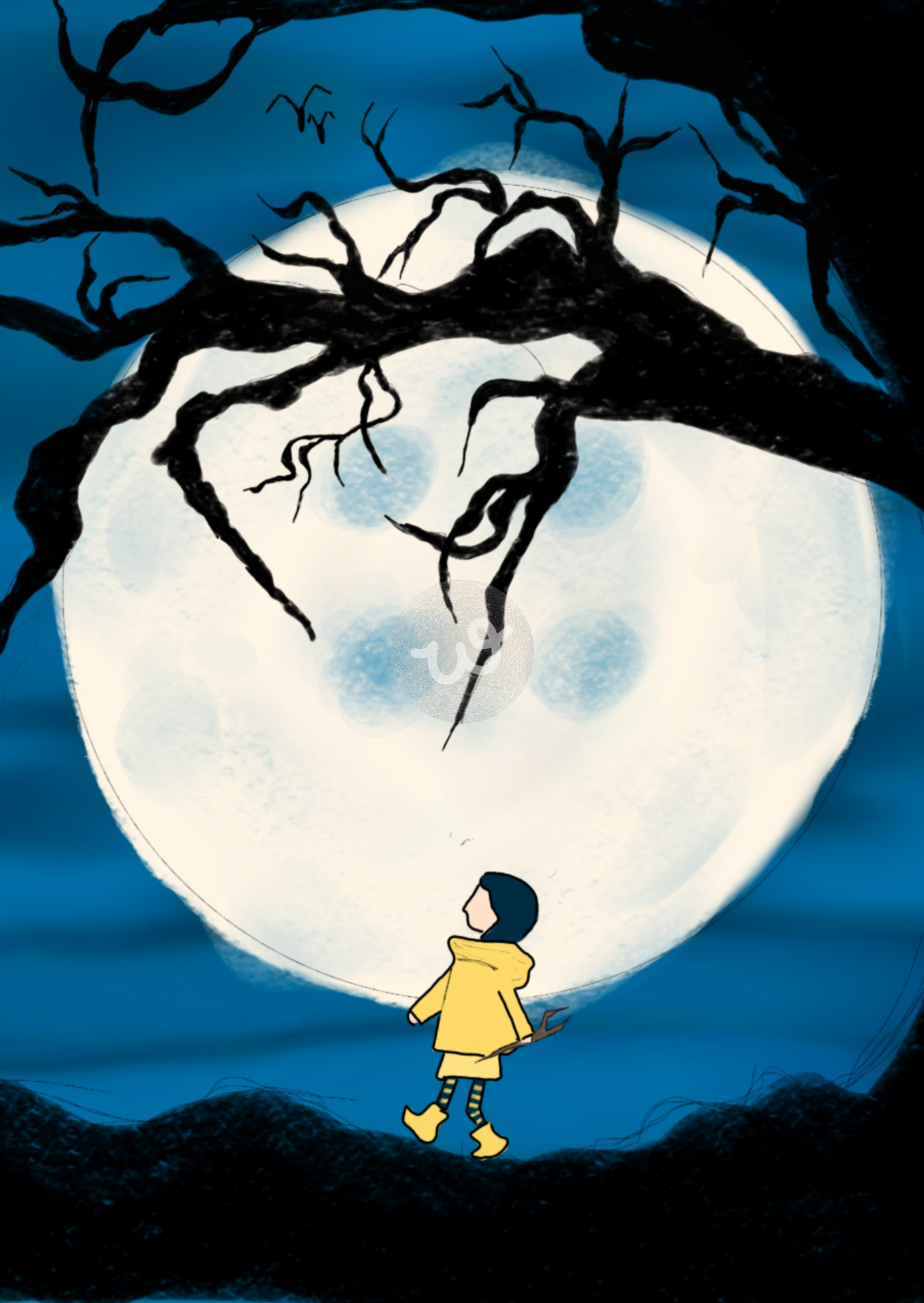 طفل بمعطف أصفر يقف أمام قمر مكتمل ضخم وسط سماء داكنة، تحيط به أغصان شجرة سوداء متشابكة، مما يضفي أجواء غامضة وساحرة