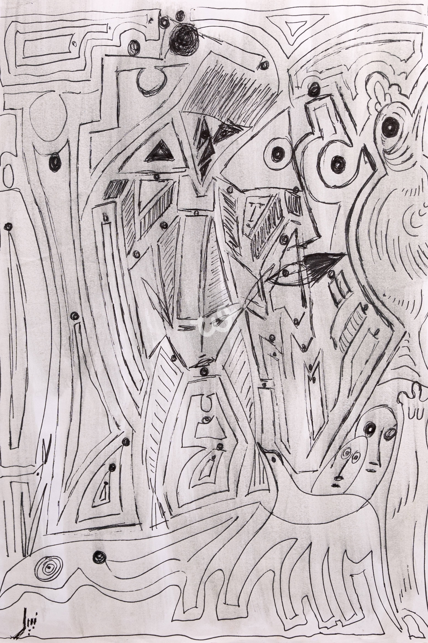 لوحة تجريدية تمزج بين الأشكال الهندسية والرمزية بطريقة مبتكرة تعكس تعقيد الحياة وتعدد التفاصيل. تضيف الأوجه والطيور المتداخلة طابعًا سرياليًا يثير التفكير ويحفز الخيال.