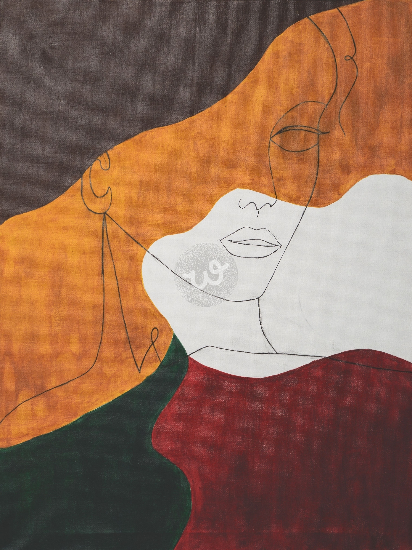 تجسد هذه اللوحة وجه امرأة غامض، يطل علينا بخطوط بسيطة وأنيقة. تتداخل الألوان الدافئة، الأصفر الذهبي والأحمر القرمزي، مع الخلفية البيضاء الداكنة، لتخلق تباينًا بصريًا مذهلاً. ينساب الوجه الأبيض بسلاسة بين الألوان، وكأنه يخرج من رحم الزمن، حاملاً معه أسرارًا وذكريات. تعكس الخطوط السوداء الرقيقة ملامح الوجه، وتضفي عليه لمسة من الحزن والجمال. يبدو الوجه وكأنه يتحدث إلينا بلغة الألوان، يهمس بأسرار دفينة، ويدعونا للتأمل في جمال الروح الإنسانية.