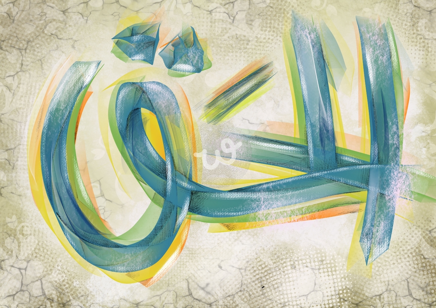لوحة عبارة عن تداخلات لونية وخطية لإسم الحق، من أسماء الله الحسنى، التداخلات اللونية والخطية روحانية تسبح في أسرار اسم الله الحق، العمل ضمن سلسلة ستكون اسماء الله الحسنى ال ٩٩