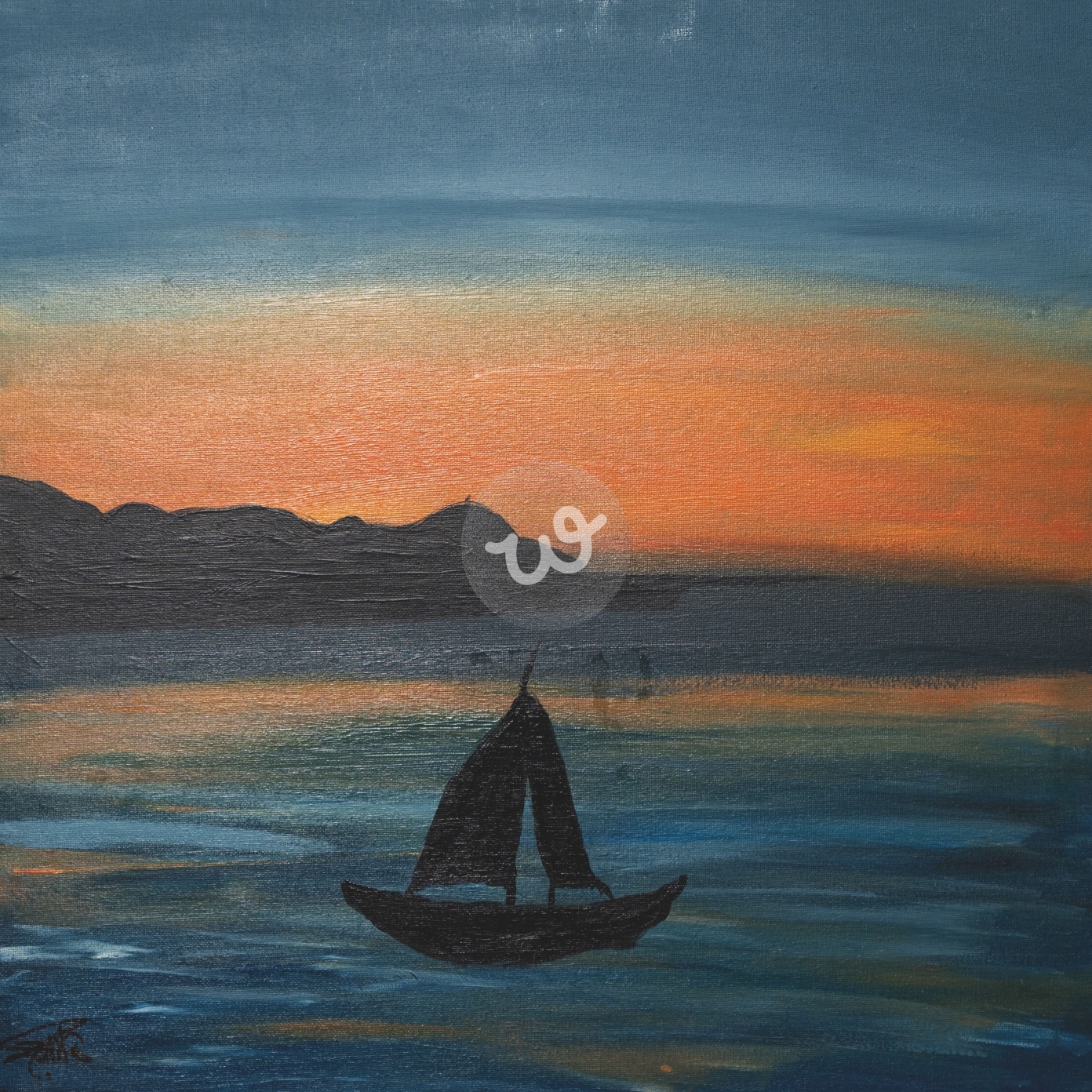 تعكس هذه اللوحة أجواءً أكثر هدوءًا وتأملًا، حيث يظهر قارب شراعي أسود يطفو على سطح البحر، وكأنه يسير بهدوء نحو الأفق. تتدرج ألوان السماء بين الأزرق العميق والبرتقالي الناعم، مما يعزز الإحساس بالصفاء والسكينة. الجبال في الخلفية تبدو كظلال بعيدة، مما يخلق بُعدًا في التكوين البصري. سطح الماء يعكس الألوان المحيطة به بطريقة ناعمة، مما يعطي إحساسًا بالانسجام بين البحر والسماء. الألوان الداكنة للقارب تجعله نقطة تركيز في المشهد، مما يضيف عنصرًا من التأمل والهدوء.