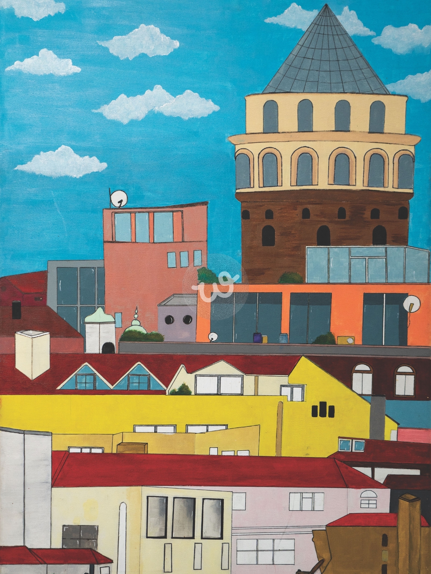تجسد هذه اللوحة الفنية سحر مدينة إسطنبول من خلال تصوير برج غلطة الأيقوني وهو يشمخ بفخر وسط مجموعة من المباني ذات الألوان الزاهية. يظهر البرج بهيبة تاريخية، بينما تضفي المباني المحيطة به لمسة عصرية وحيوية على المشهد. تتناغم ألوان اللوحة بتناغم مدهش، حيث تتداخل درجات الأصفر والأحمر والبرتقالي مع الأزرق السماوي، مما يخلق تباينًا بصريًا ممتعًا. السماء الزرقاء الصافية تتزين ببعض الغيوم البيضاء الرقيقة، مما يضيف عمقًا وبعدًا إلى اللوحة.