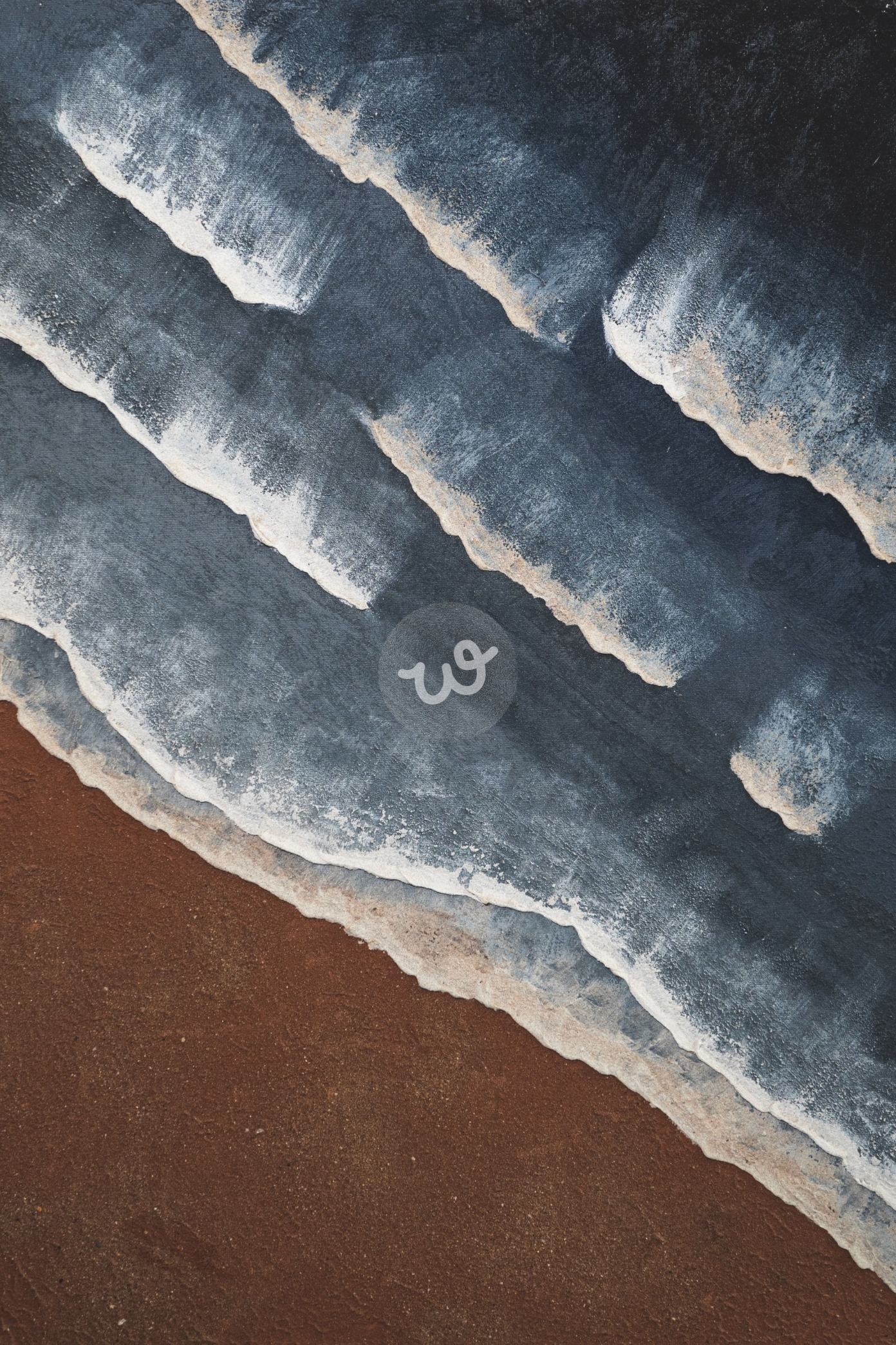 تصور هذه اللوحة مشهدًا تجريديًا يذكرنا بموج البحر وهو يلامس الشاطئ، حيث تمتزج طبقات من الألوان الداكنة مع الأبيض بطريقة ناعمة تحاكي حركة الأمواج المتكسرة. يظهر تدرج الألوان بين الأزرق والأسود في المياه، بينما تأخذ الرمال لونًا دافئًا يميل إلى البني، مما يخلق تباينًا متناغمًا بين العناصر