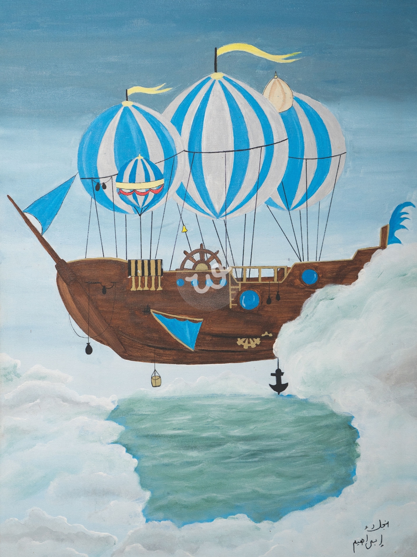 تأسر هذه اللوحة الخيالية الألباب برحلة إلى عالم الأحلام، حيث تبحر سفينة مهيبة في سماء لا متناهية. تتزين السفينة بثلاثة بالونات عملاقة مخططة بالأزرق والأبيض، تحملها برفق فوق بحر من الغيوم الرقيقة. تظهر تفاصيل السفينة ببراعة، من عجلة القيادة الخشبية إلى المرساة المتدلية، مما يضفي عليها طابعًا سحريًا. تتناغم ألوان اللوحة الهادئة، حيث يمتزج الأزرق السماوي مع الأبيض الناصع والبني الدافئ، ليخلقوا جوًا من السكينة . تبدو السفينة وكأنها تحلق في عالم موازٍ، حيث الأحلام تتحقق والخيال لا يعرف حدودًا.