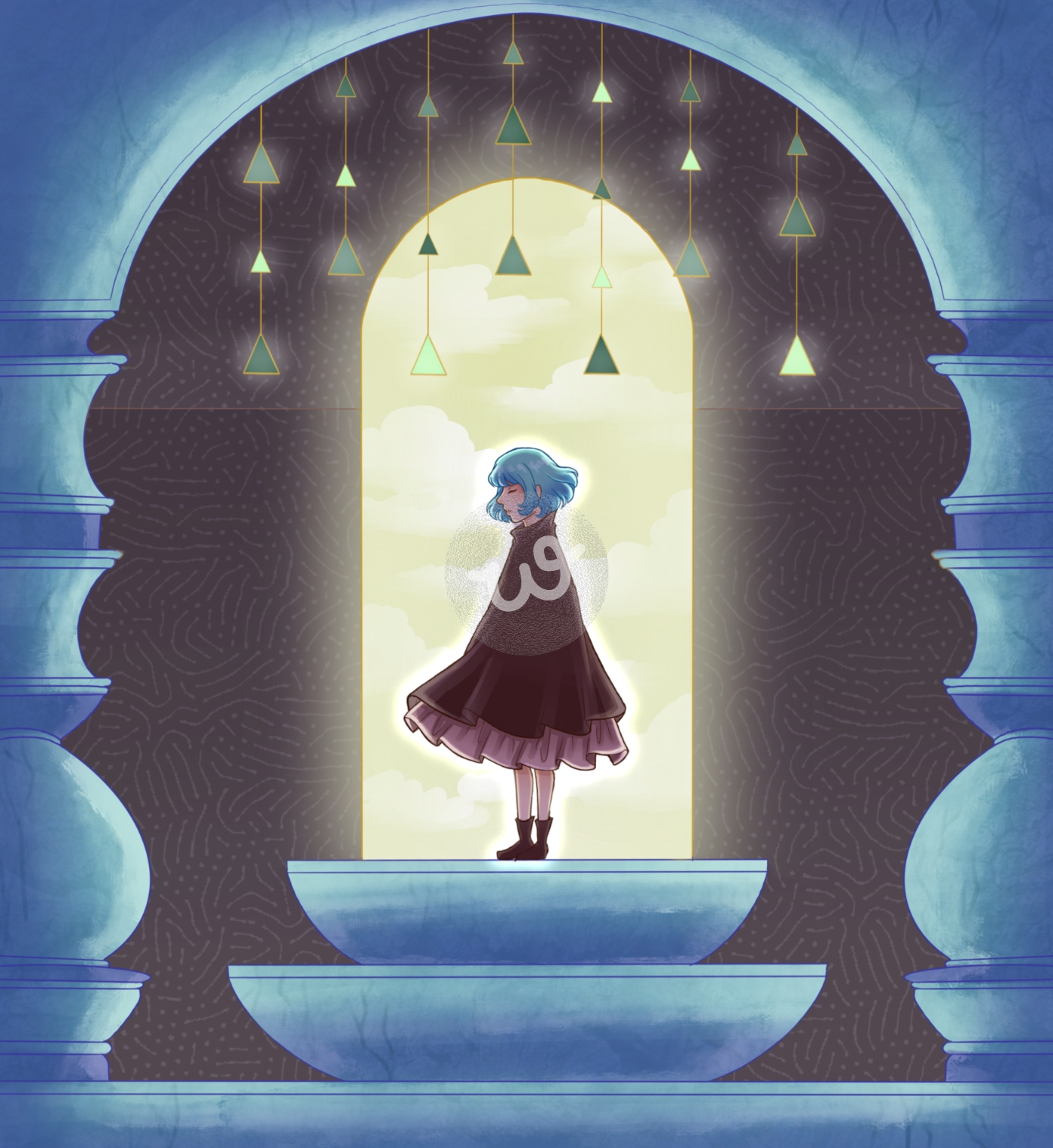 رسمة لشخصية اساسية من لعبة شهيرة تدعى Gris تقف عند النافذه