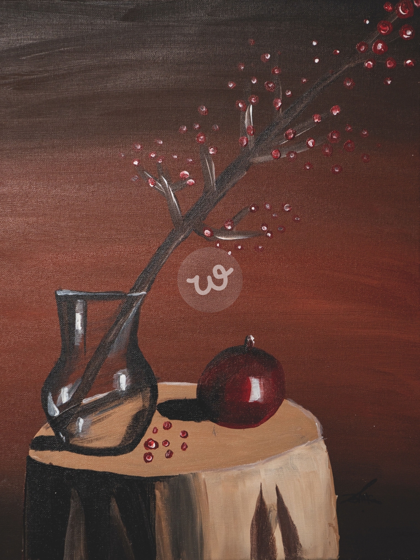 اللوحة تصور مشهداً هادئاً وأنيقاً يعكس طابعاً كلاسيكياً دافئاً. تتضمن اللوحة مزهرية زجاجية شفافة تحتوي على غصن شجرة داكن اللون، تتناثر عليه زهور أو حبات صغيرة حمراء، مما يضفي عليها لمسة من الحيوية والتباين. بجانب المزهرية، وُضعت ثمرة رمان حمراء لامعة، مع بضع حبات من الرمان متناثرة بجوارها. الخلفية ذات تدرجات بنية دافئة، تعزز من الطابع الهادئ للوحة وتعكس إحساساً بالدفء والسكينة. التباين بين العناصر الشفافة والعاكسة للضوء، مثل الزجاج والرمان، يضيف عمقاً جمالياً إلى التكوين الفني