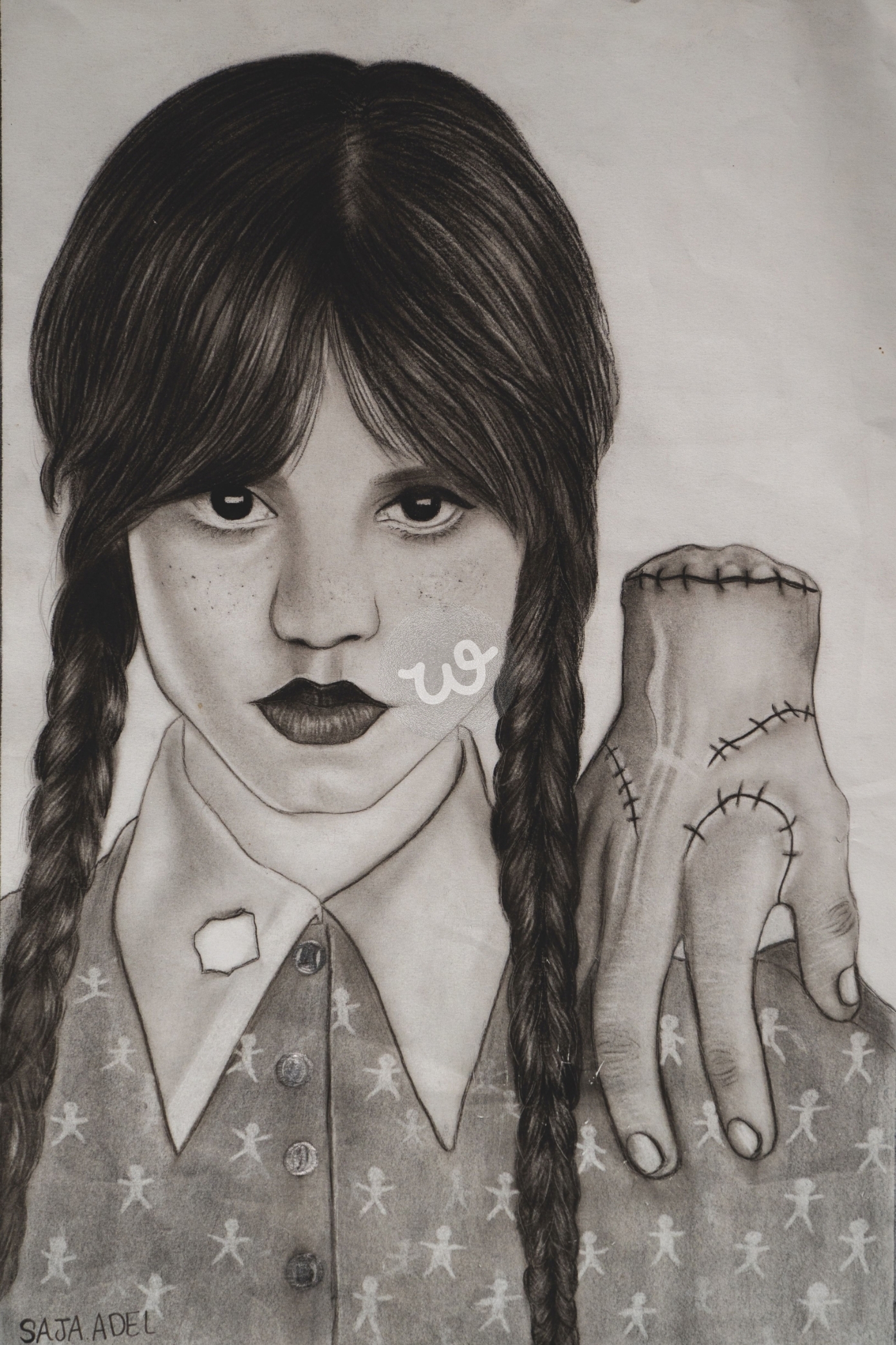 في هذه اللوحة التي رسمتها، أردت أن أخلق تباينًا ملفتًا بين البراءة والغموض. تظهر فتاة بشعر طويل ومضفر، ترتدي قميصًا بياقة بيضاء وفستانًا مزخرفًا بأشكال تشبه الدمى، مما يعكس إحساسًا بالطفولة والنعومة. لكن الجزء العلوي من وجهها مغطى، مما يضيف إحساسًا بالغموض. بجانبها، رسمت يدًا كبيرة ومخيفة، تبدو وكأنها مخيطة بخيوط، لتعطي انطباعًا بأنها يد دمية أو كائن غريب. أردت من هذه اللوحة أن تنقل مشاعر متناقضة تجمع بين البراءة والغرابة، وتثير تساؤلات وفضول من ينظر إليها