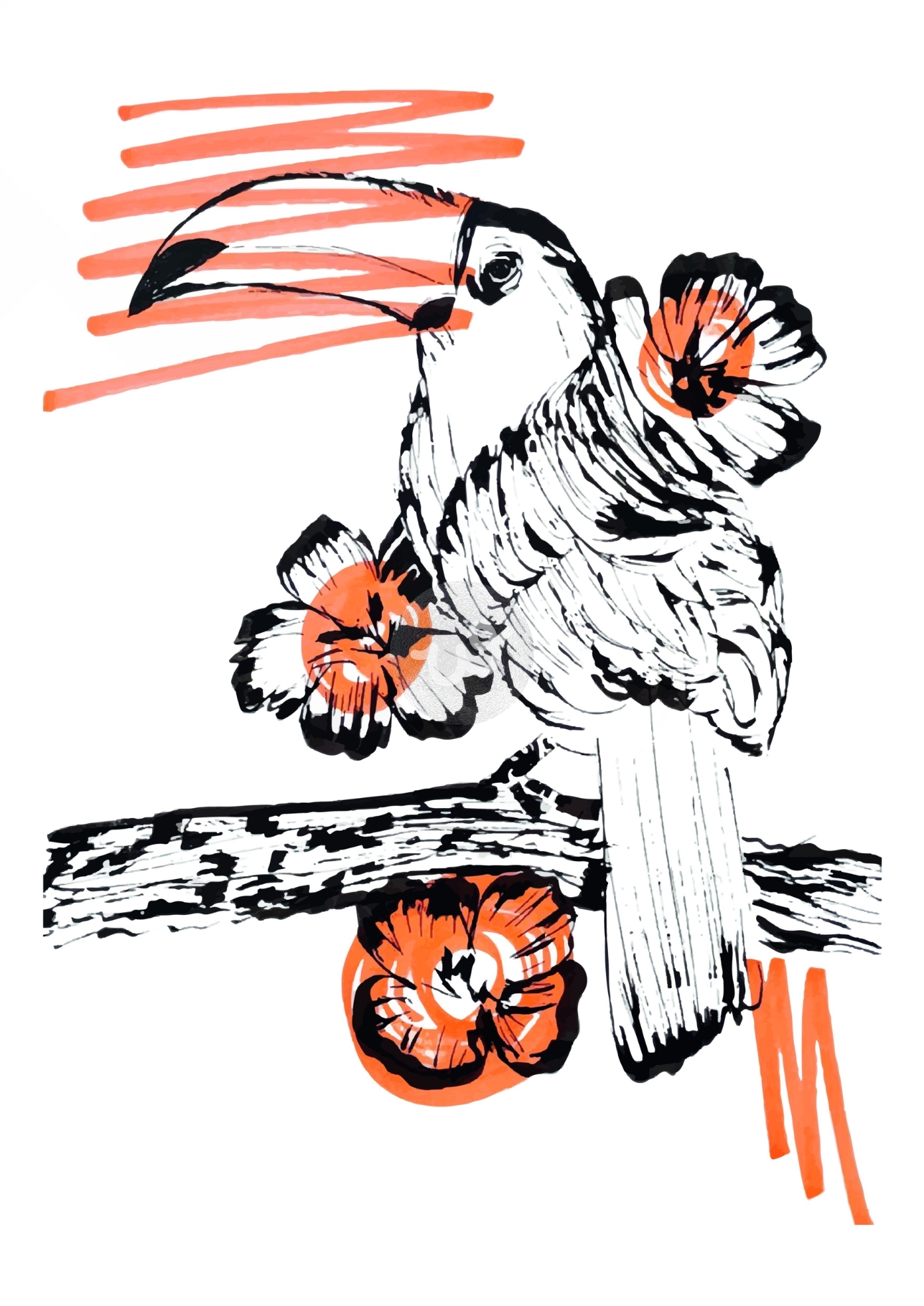 يجسد هذا العمل الفني طائر الطوقان محاطًا بالزهور البرية، حيث يندمج الحبر الأسود مع لمسات الماركر ليخلق تباينًا لافتًا. يضفي اللون البرتقالي الجريء طاقة وحيوية، مما يبرز تفاصيل الطائر والزهور. تتنوع الخطوط بين الدقة والانسيابية، مما يعكس توازنًا بين التشكيل الحر والتفاصيل المدروسة.