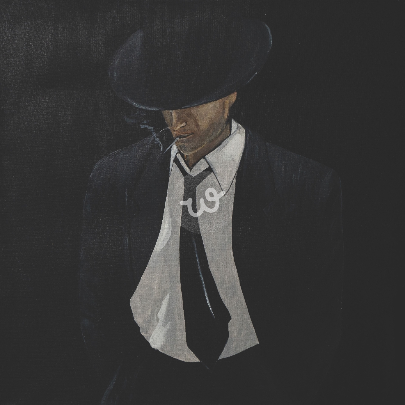 تصور هذه اللوحة رجلًا أنيقًا يرتدي بدلة سوداء وقميصًا أبيض، يظهر في ظلام دامس، مما يضفي عليه طابعًا غامضًا. يضع الرجل قبعة سوداء تخفي جزءًا من وجهه، ويدخن سيجارة، مما يزيد من غموضه وجاذبيته. تتناقض الألوان الداكنة للبدلة والقبعة مع اللون الأبيض للقميص، مما يخلق تباينًا بصريًا قويًا. يعكس العمل الفني أجواءً من التشويق والإثارة، ويدعو المشاهدين إلى التأمل في شخصية الرجل وأفكاره. يبدو الرجل وكأنه شخصية من فيلم سينمائي كلاسيكي، يتمتع بجاذبية خاصة وسحر لا يقاوم.