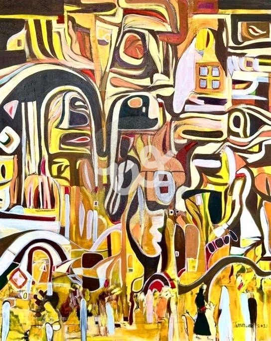 أردت من خلال هذا العمل استكشاف حالة الضياع والانغماس في بيئة حضرية متعددة الأوجه. المدينة ليست مجرد مكان جغرافي، بل كيان يتشكل من التفاعلات الإنسانية، الأصوات، والألوان المتداخلة. لذلك، اعتمدت على الأسلوب التجريدي للتعبير عن هذه الحالة النفسية بدلاً من تصويرها بشكل واقعي. العمل يعتمد على استخدام الألوان الصفراء والبرتقالية والبنية، التي تثير الشعور بالدفء والعمق. الأشكال المجرّدة والأقواس تشير إلى معالم معمارية في المدينة، بينما الخطوط السوداء العريضة تضفي تأثيرًا دراميًا وتوجيهًا للنظر عبر اللوحة.