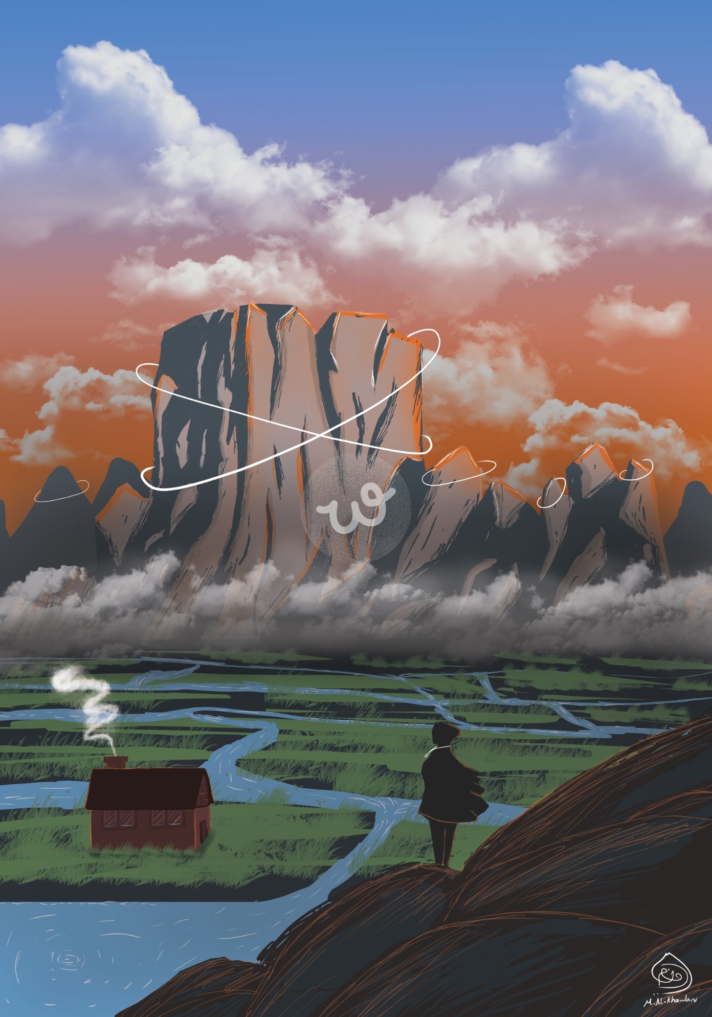منظر خيالي لغروب وجبال ووديان حيث ان الجبال يوجد فيها لعنه ولابد من الشخصية من فك اللعنه من خلال القلاده الموجودة في عنقها
