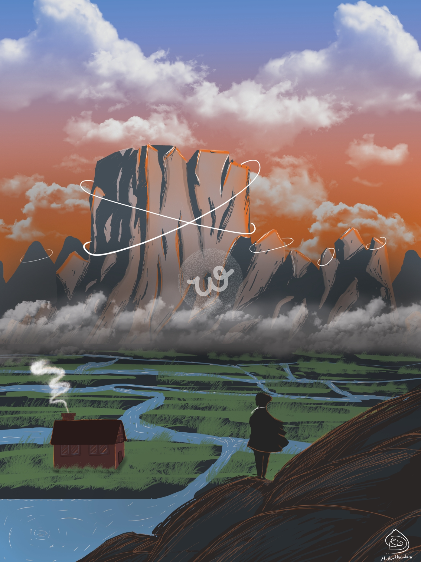 منظر خيالي لغروب وجبال ووديان حيث ان الجبال يوجد فيها لعنه ولابد من الشخصية من فك اللعنه من خلال القلاده الموجودة في عنقها