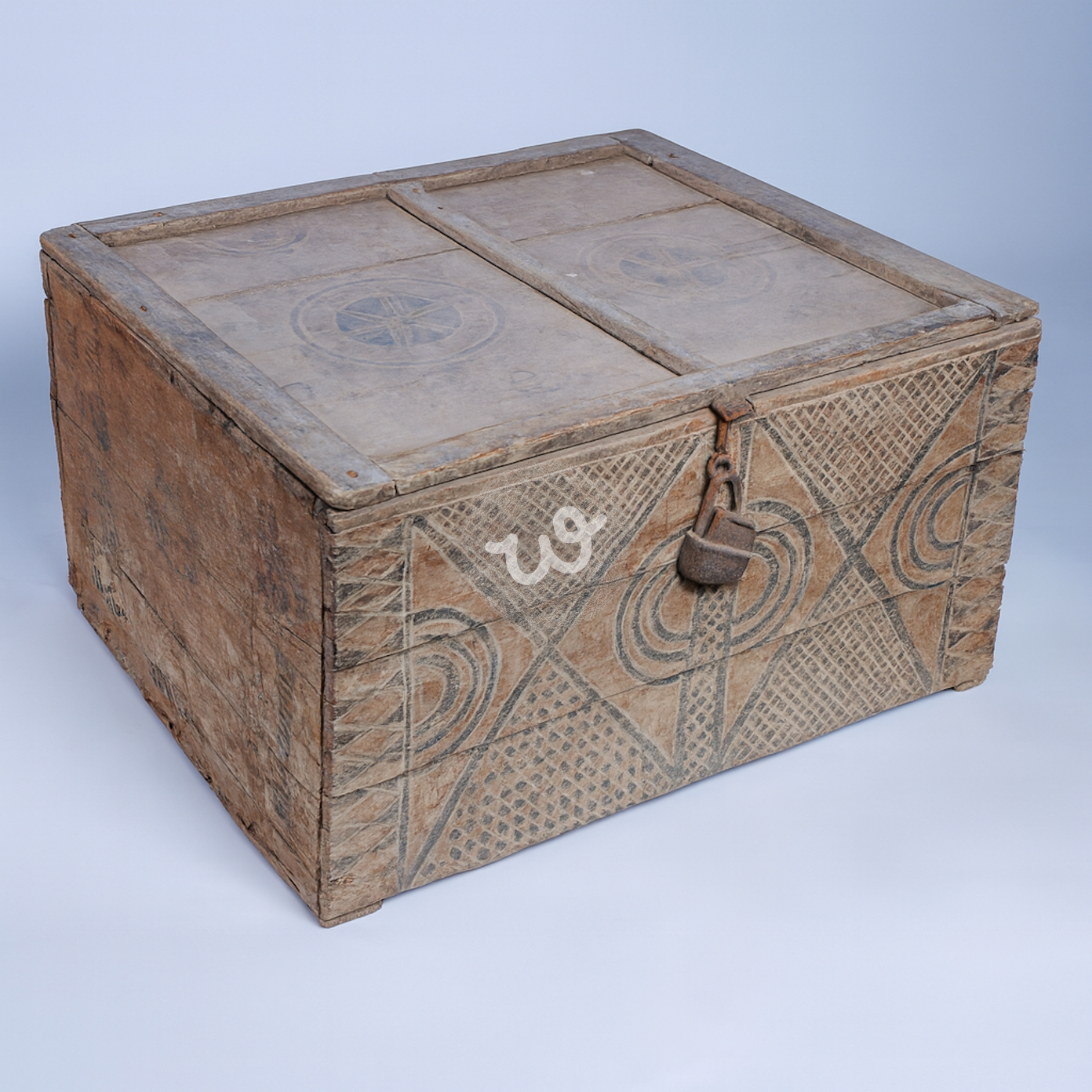 صندوق خشبي قديم بزخارف هندسية وأشكال منحوتة مزود بقفل معدني.