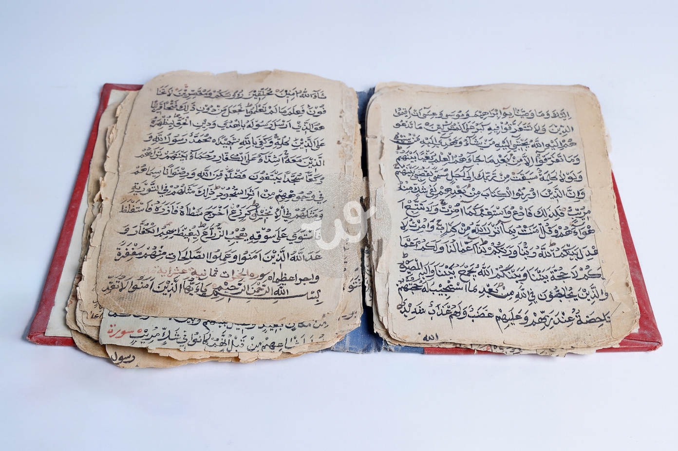 مخطوطة قرآنية قديمة ومجلدة ومكتوبة بخط اليد تظهر آيات من سورة الشورى والفتح.