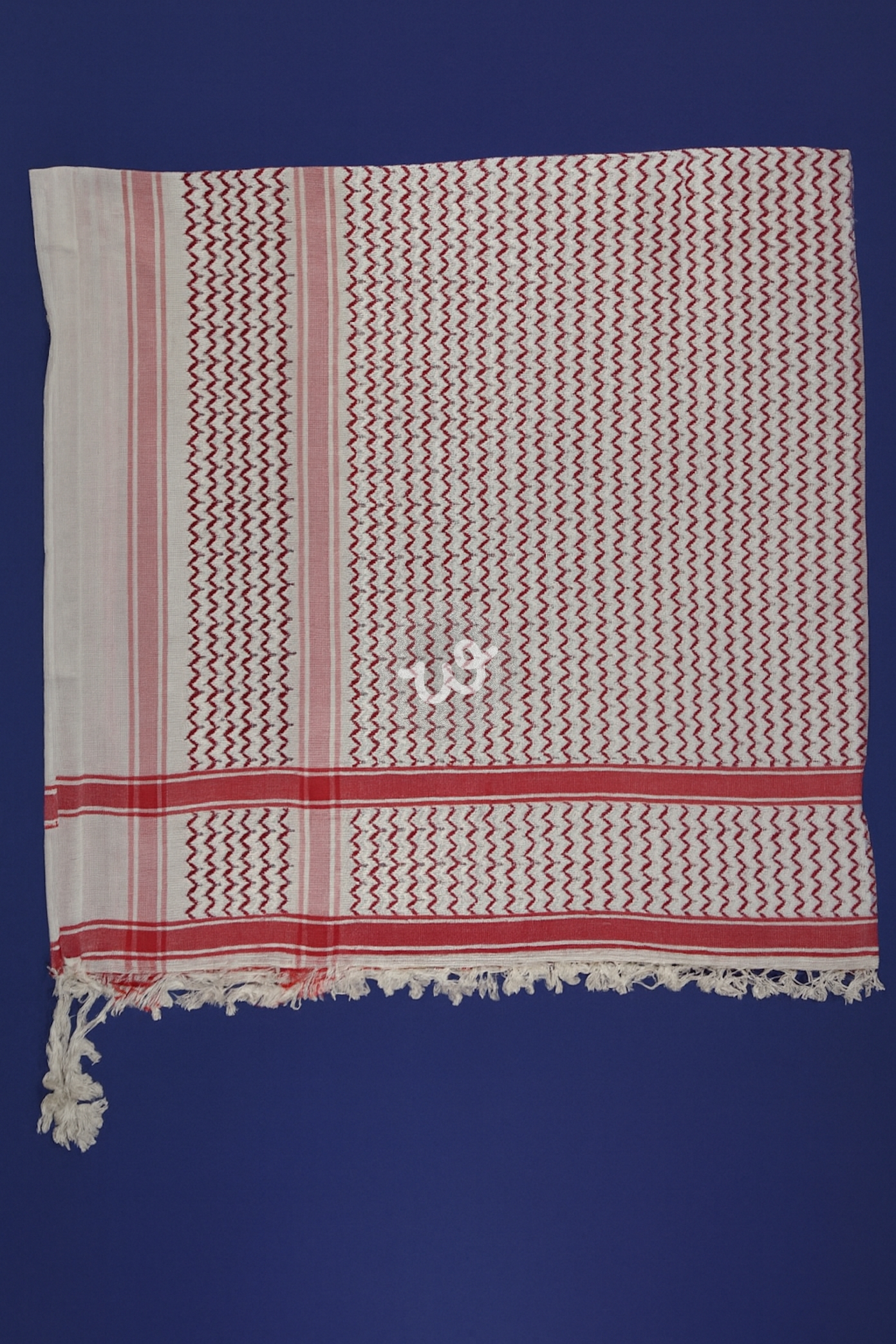 صورة على خلفية زرقاء لشماغ تقليدي أحمر وأبيض مصنوع من القطن .