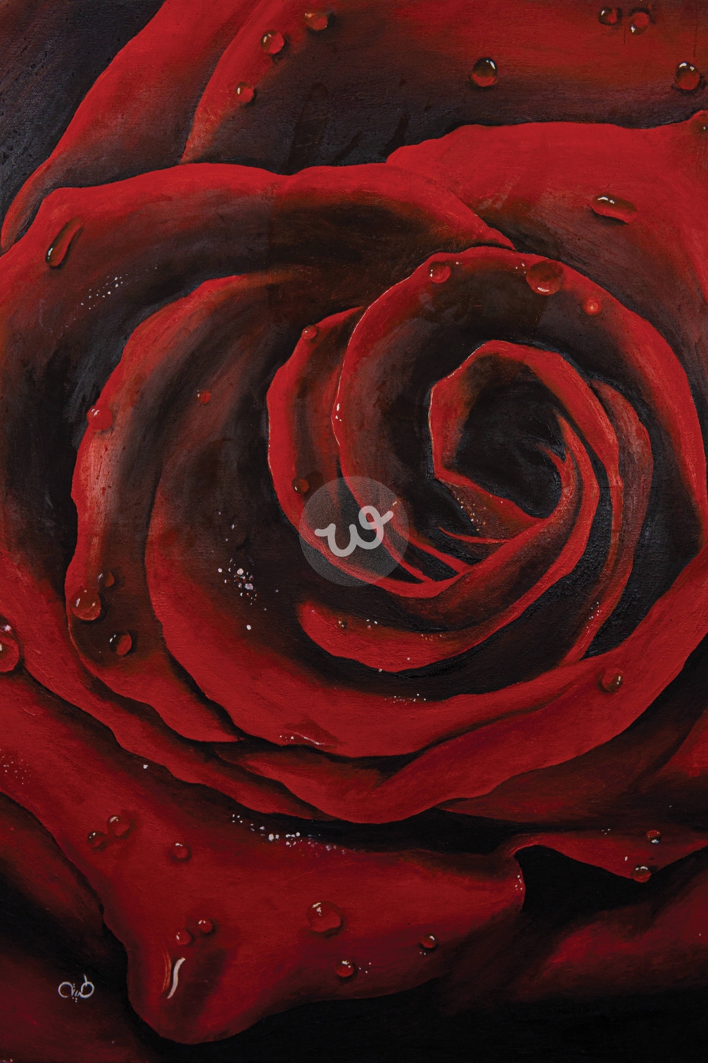 وردة بارزة لونها احمر مشبع لامع تتخللها قطرات الندى خفيفة على بتلاتها تروي عطشها وتحييها يتخللها ظلال اسود قاتم يزيدها تلألؤاً وبروزاً