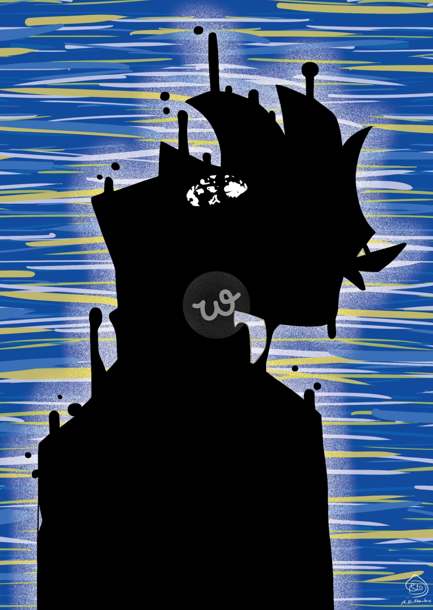 الرسمة اخذت طابع رسم فان جوخ ولكن من غير التفافات الضوء تم وضعها بشكل مستقيم لتبين الطابع الحاد من شخصية الرسام وبالنسبة للشخصية توضح معاناة الرسام في رسم اللوحه وانكسار رؤيته للعالم