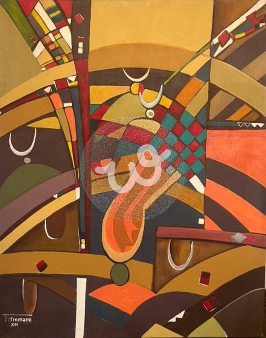 عمل تجريدي حديث، يتميز بأشكال هندسية متداخلة وألوان دافئة وجريئة. الوان اكريلك على كانفس