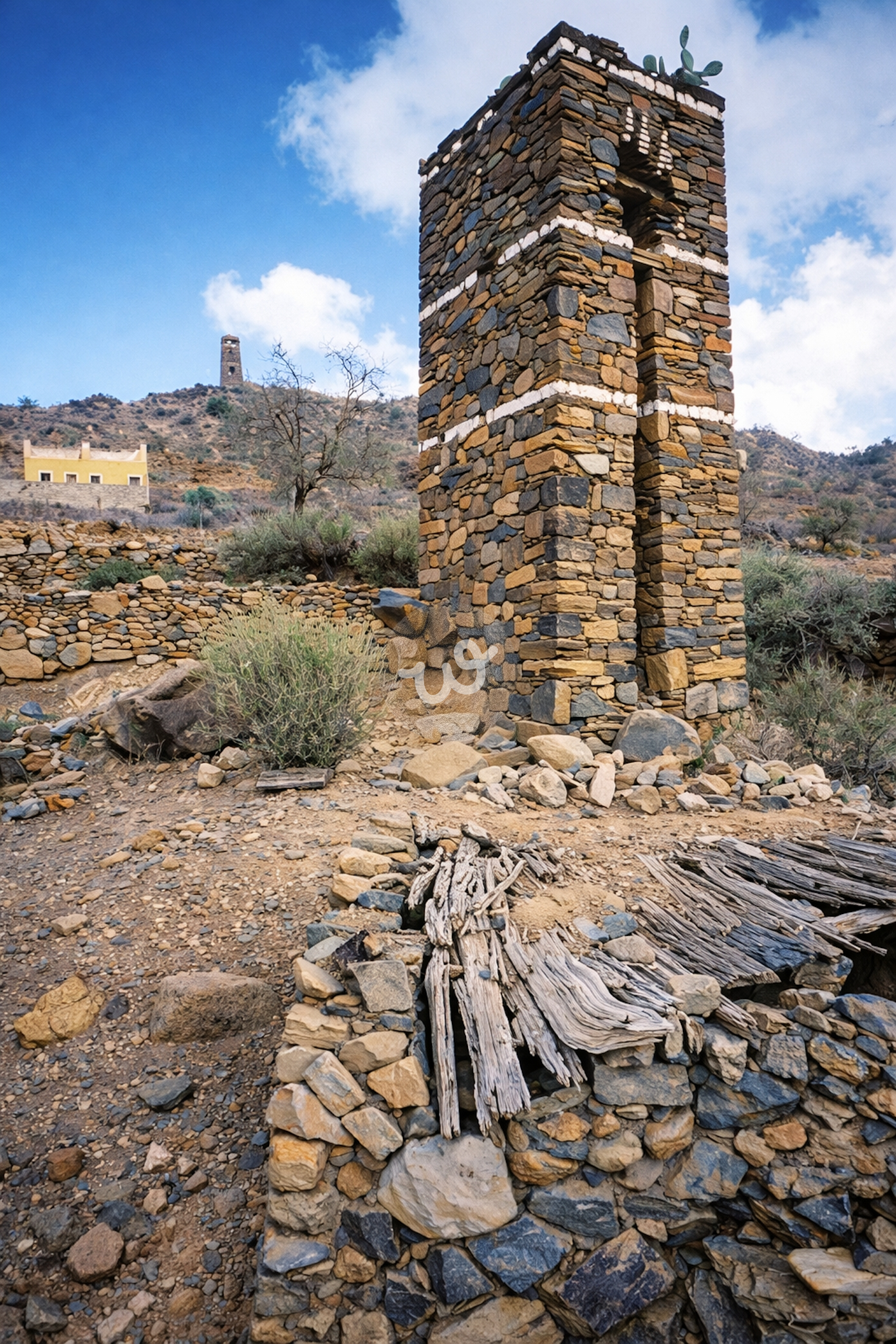برج حجري قديم بُني للحماية والمراقبة، يعكس الطابع الدفاعي للقرى الجبلية.