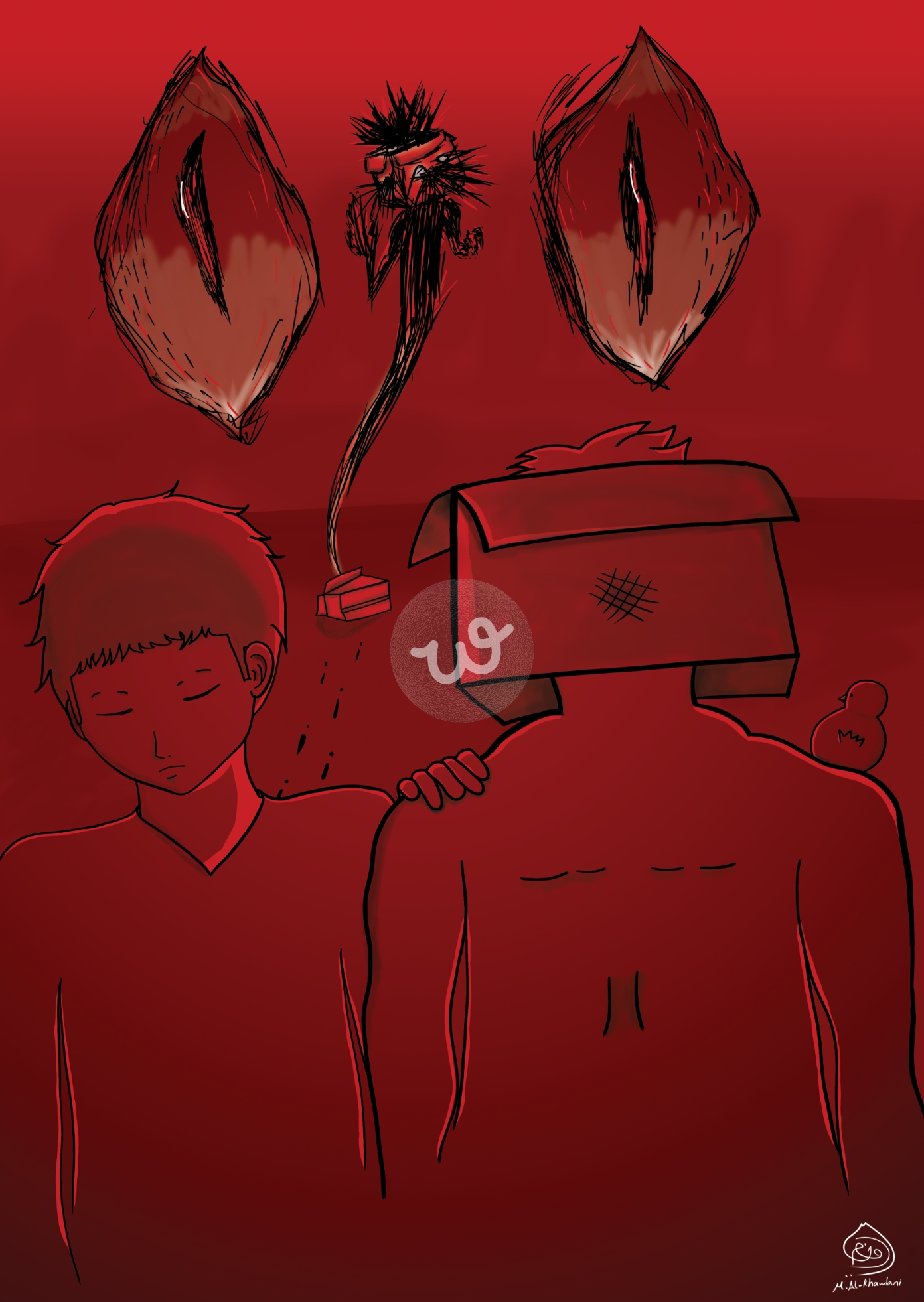 هناك شخصية مرت في وضع صعب من الضغوطات النفسيه ف الصندوق الذي في الخلف بهيئة وحش يبين المعاناه الذي مر فيها الشخص ولكنه تخطاها ، ثم رأى شخص اخر لديه نفس المشكله النفسيه ونفس الصندوق ف حاول مساعدته
