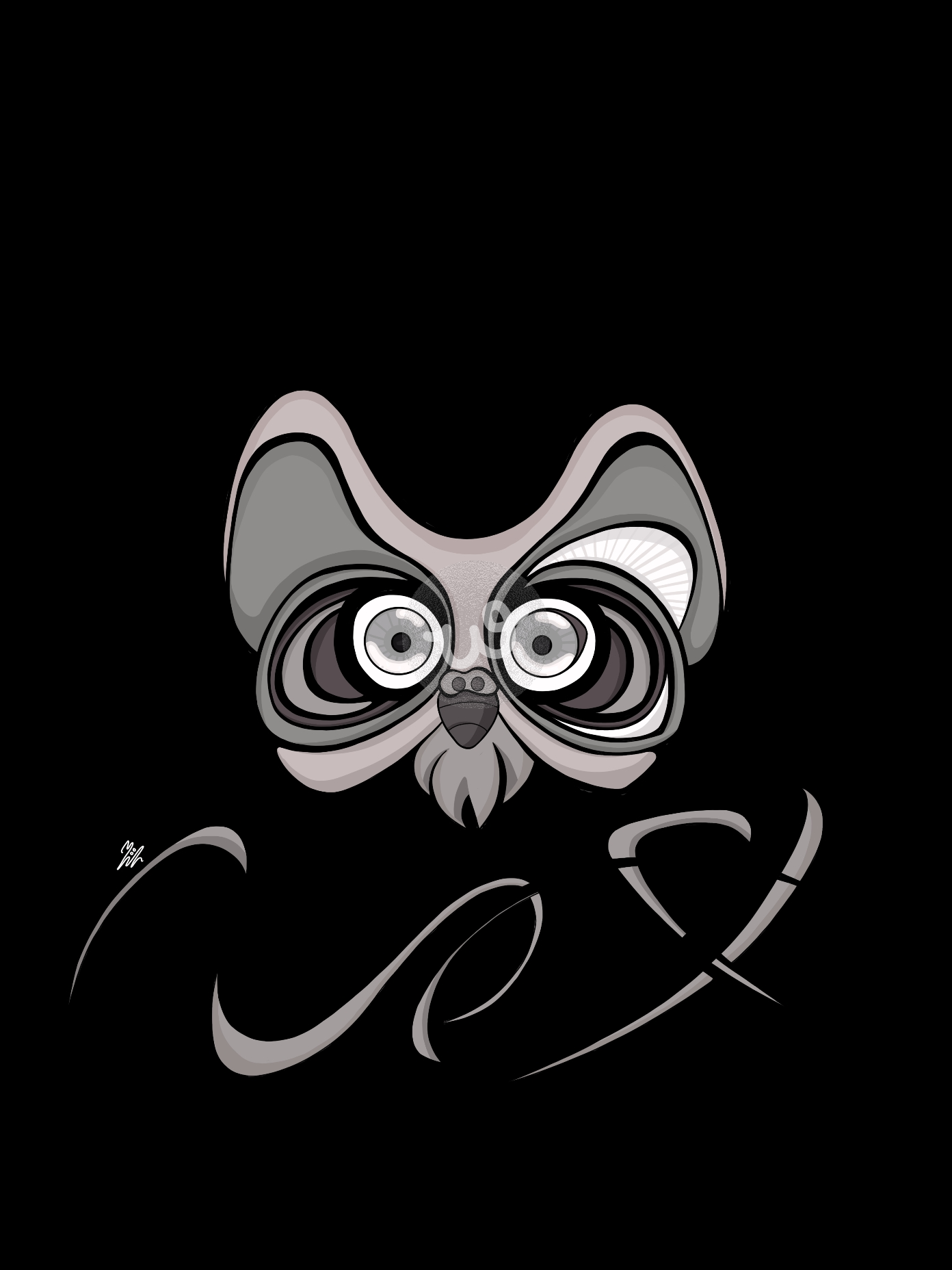 رسم لبومة عجيبة بخطوط منحنية تُحدق للأمام بأعين متلئلئة