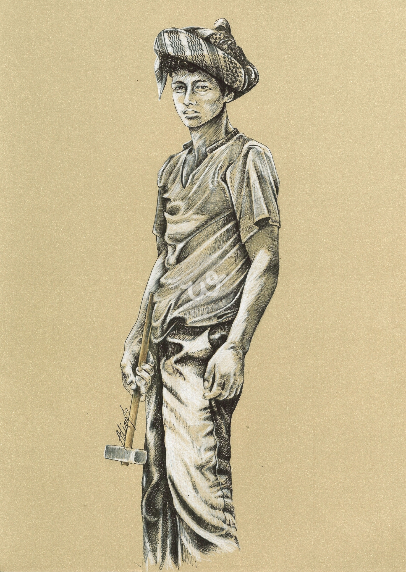 رسمة لعامل الصخور وهو يحمل المطرقة لتكسير وتشكيل ونقر الصخور لتجهيزها للبناء