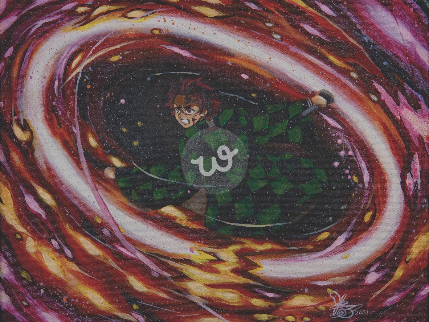 لوحة ديناميكية مستوحاة من أنمي "Demon Slayer"، تُجسد شخصية "تانجيرو" وهو يندفع بقوة وسط دوامة نارية عنيفة. الألوان المتوهجة والحركة الدائرية تعكس الصراع والشجاعة والعزيمة في قلب المعركة،