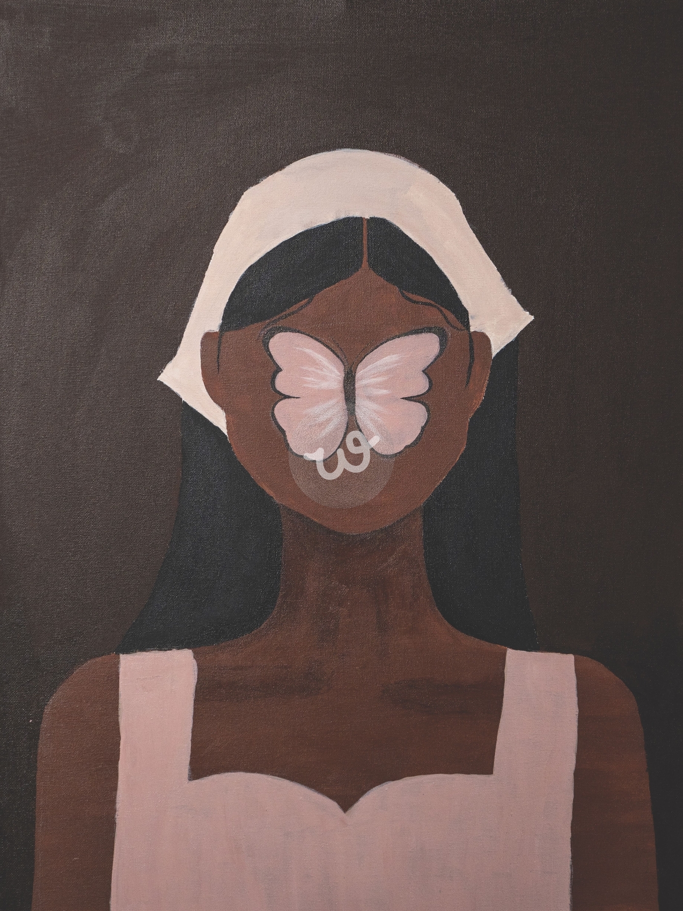 الصورة عبارة عن لوحة فنية تجريدية تصور فتاة ذات بشرة داكنة ترتدي غطاء رأس أبيض وفستانًا ورديًا فاتحًا. تتميز اللوحة بأسلوب بسيط وألوان هادئة، حيث تم استبدال ملامح وجه الفتاة بفراشة بيضاء ذات تدرجات وردية. الخلفية الداكنة تعزز التباين بين العناصر، مما يجعل الفراشة نقطة التركيز الرئيسية. قد ترمز الفراشة إلى الحرية، التحول، أو فقدان الهوية، حيث تندمج مع الوجه بطريقة توحي بالغموض. اللوحة تحمل طابعًا هادئًا ومعبّرًا، وقد تعكس مشاعر التأمل، البحث عن الذات، أو التجرد من قيود المجتمع.