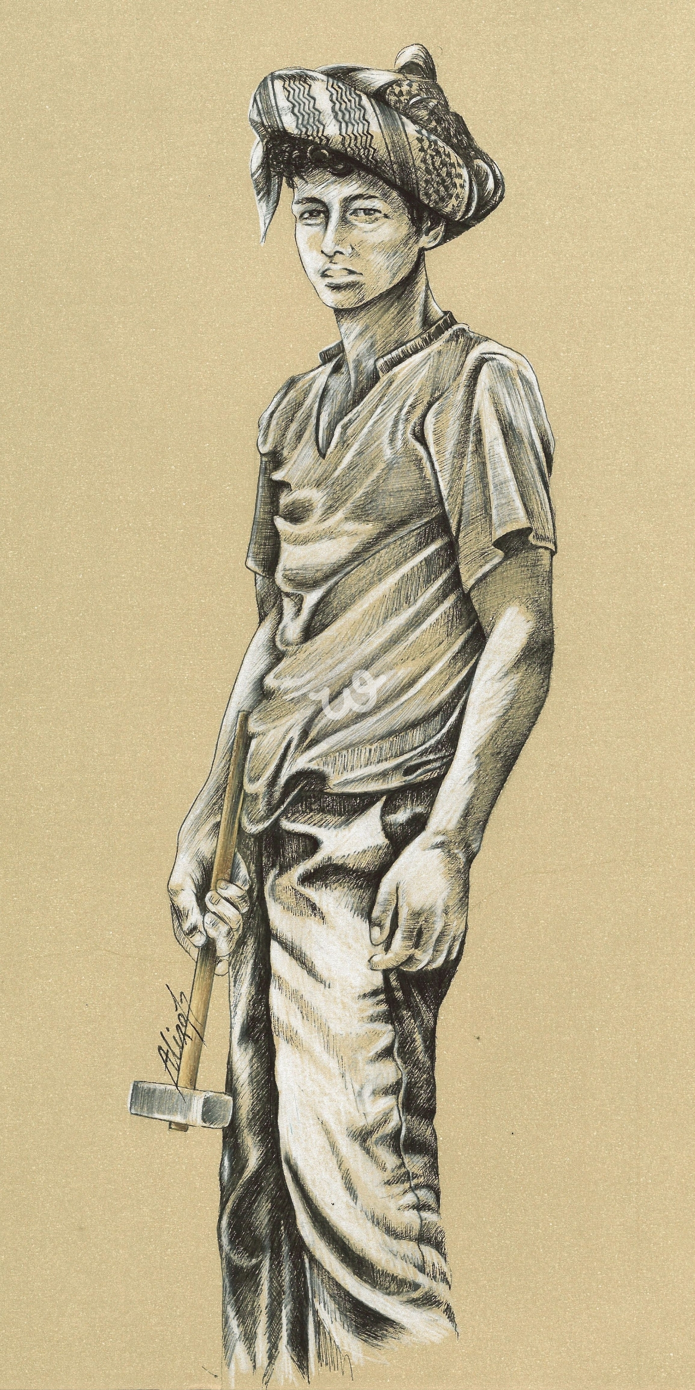 رسمة لعامل الصخور وهو يحمل المطرقة لتكسير وتشكيل ونقر الصخور لتجهيزها للبناء