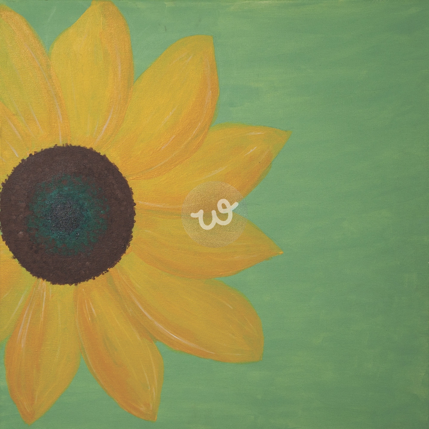 الصورة عبارة عن لوحة فنية مرسومة بأسلوب بسيط تصور زهرة عباد الشمس بألوان دافئة ومشرقة. تحتل الزهرة الزاوية اليسرى من اللوحة، بينما تمتد خلفية خضراء ناعمة على باقي المساحة. يتدرج لون بتلات الزهرة بين الأصفر والبرتقالي، مما يضفي عليها مظهرًا حيويًا وطبيعيًا. مركز الزهرة بني غامق مع لمسة من الأخضر الداكن، مما يضفي عمقًا وتفاصيل إضافية على العمل الفني. تركيبة اللوحة تركز على التباين بين الألوان الدافئة والباردة، مما يجعل الزهرة تبدو نابضة بالحياة.