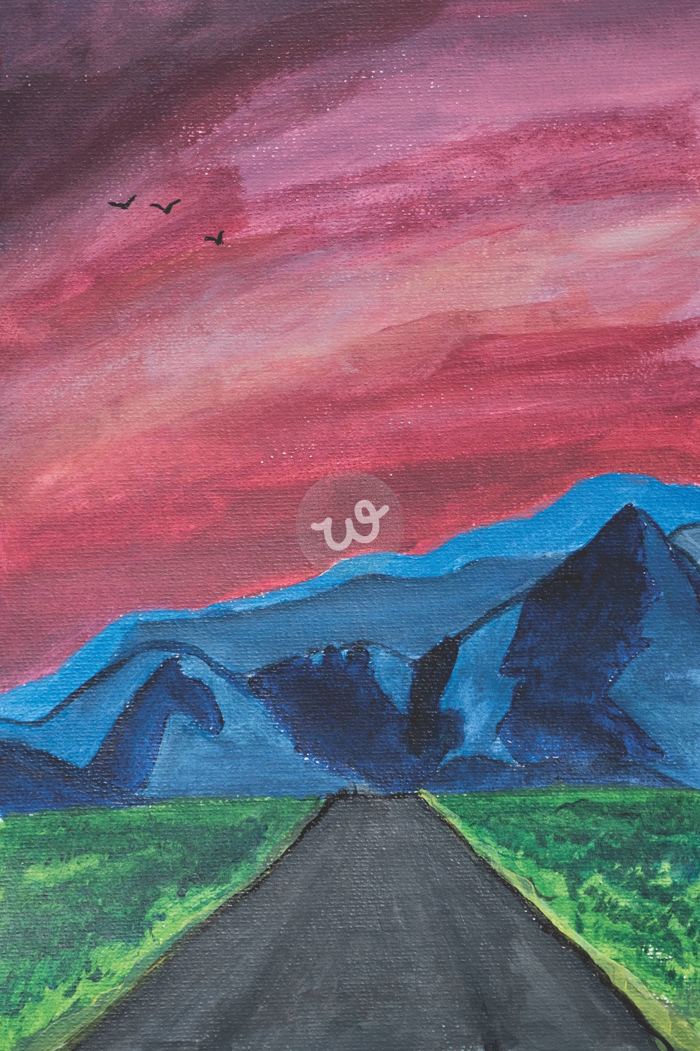 تُظهر اللوحة مشهدًا طبيعيًا مذهلاً حيث يمتد طريق ريفي أمام خلفية من جبال زرقاء شاهقة. السماء تُشعل بظلال متدرجة من الأحمر والوردي، مما يوحي بوقت الفجر أو الغروب، ويخلق تباينًا ساحرًا مع برودة الجبال الزرقاء. هناك ثلاثة طيور تحلق في السماء، تضيف لمسة من الحياة والحركة إلى المشهد.